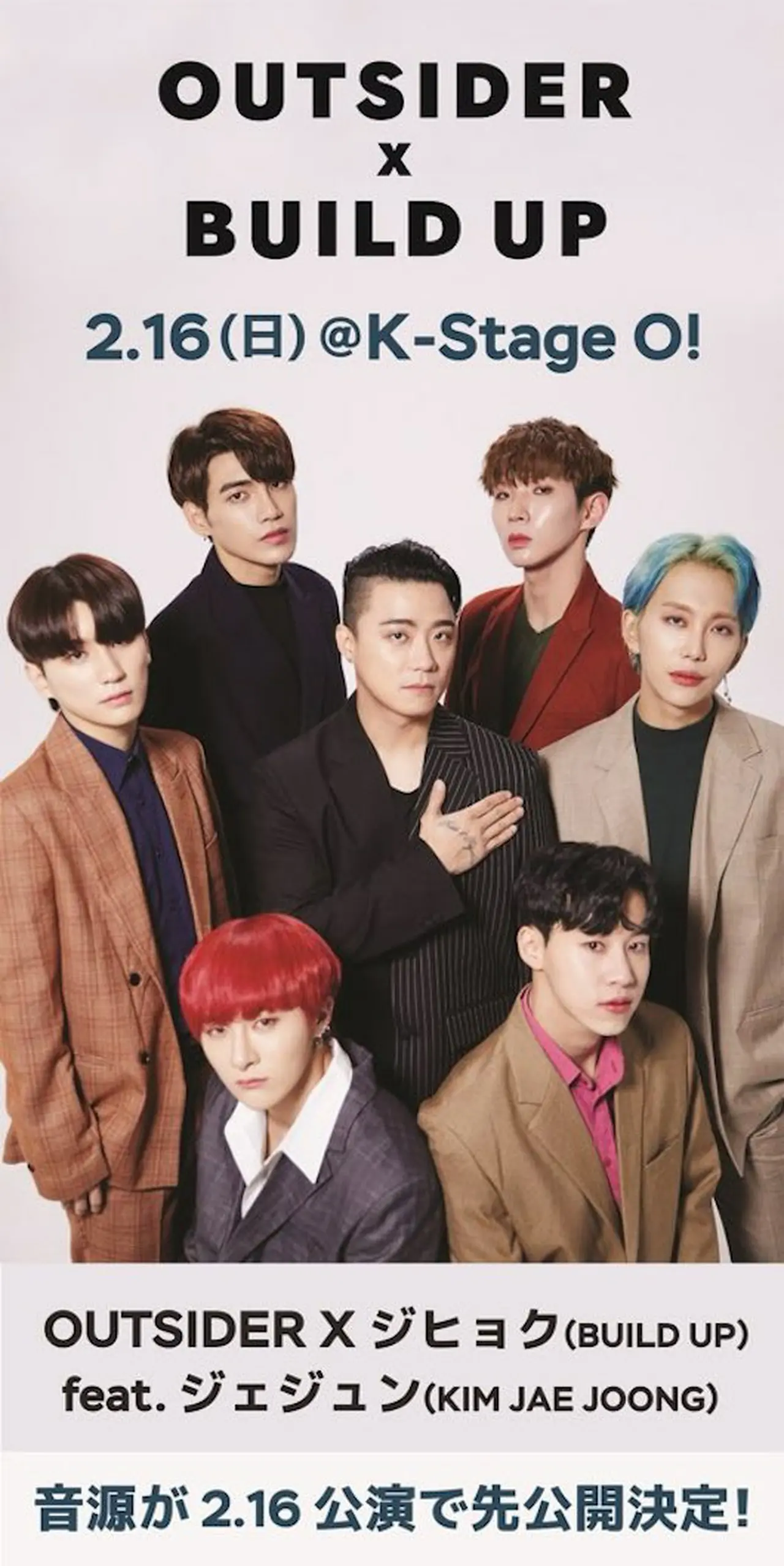 このコンサートはOutsiderがプロデュースする新人グループ:BUILD UP(ビルドアップ)と共に今後予定しているアジアツアーライブショーケースの第一弾のイベントとして2月16日(日)東京・新大久保のK-stageO!にて開催される。