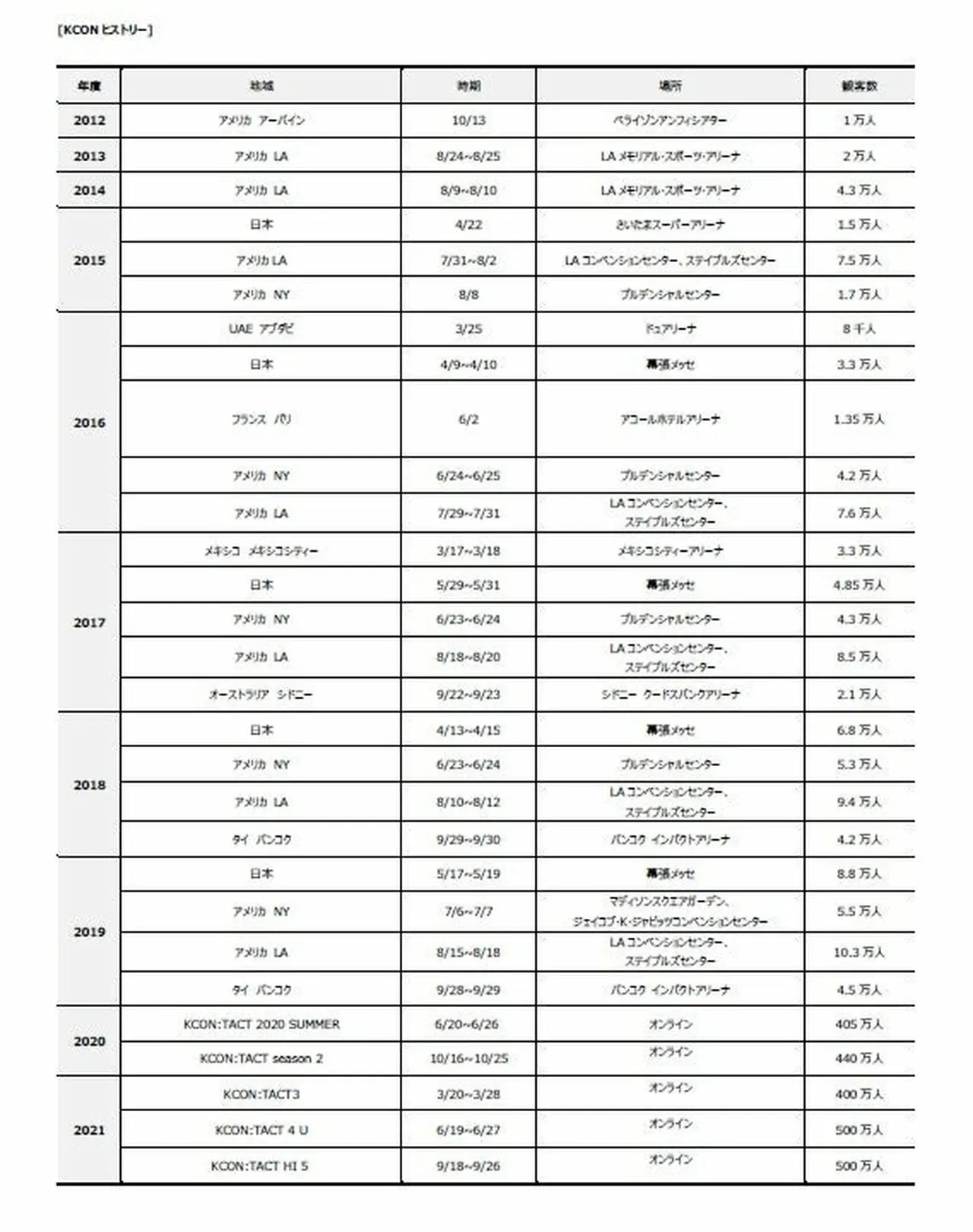 2012年にアメリカのカリフォルニアで始まったKCONは、北米、中東、ヨーロッパなど世界9都市で110万人以上の観客を集め、K-カルチャーのデジタル化を牽引する役割を果たしてきました。初年度に1万人からスタートし、直近最後の対面公演だった2019年には29万1千人余りの観客を記録するなど、実に29倍の成長を記録し、名実共にグローバルK-カルチャーフェスティバルとなりました。パンデミックにより対面公演が容易でなかった2020年からは「KCON:TACT」を通じてデジタルプラットフォームで世界中のK-カルチャーファンに会い、時間と場所にかかわらずK-カルチャーを楽しめるようにしユーザーに新しい経験を提供するとともに、非接触型フェスティバルへとさらに進化を遂げたという評価を受けました。