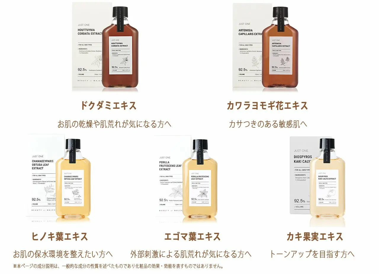 ドクダミは”肌荒れ”、カワラヨモギ花は”カサつき“を防いでてくれます*1。ヒノキ葉は”水分チャージ”、エゴマ葉は”お肌の保護”、カキ果実は”くすみ*1”に対して、優しくアプローチします。洗顔後の素肌にそのまま浸透*2させるのが「JUST ONE」の基本的な使い方ですが、いつものスキンケア製品に5~10%加えたり、複数の種類を加えることもできます。
