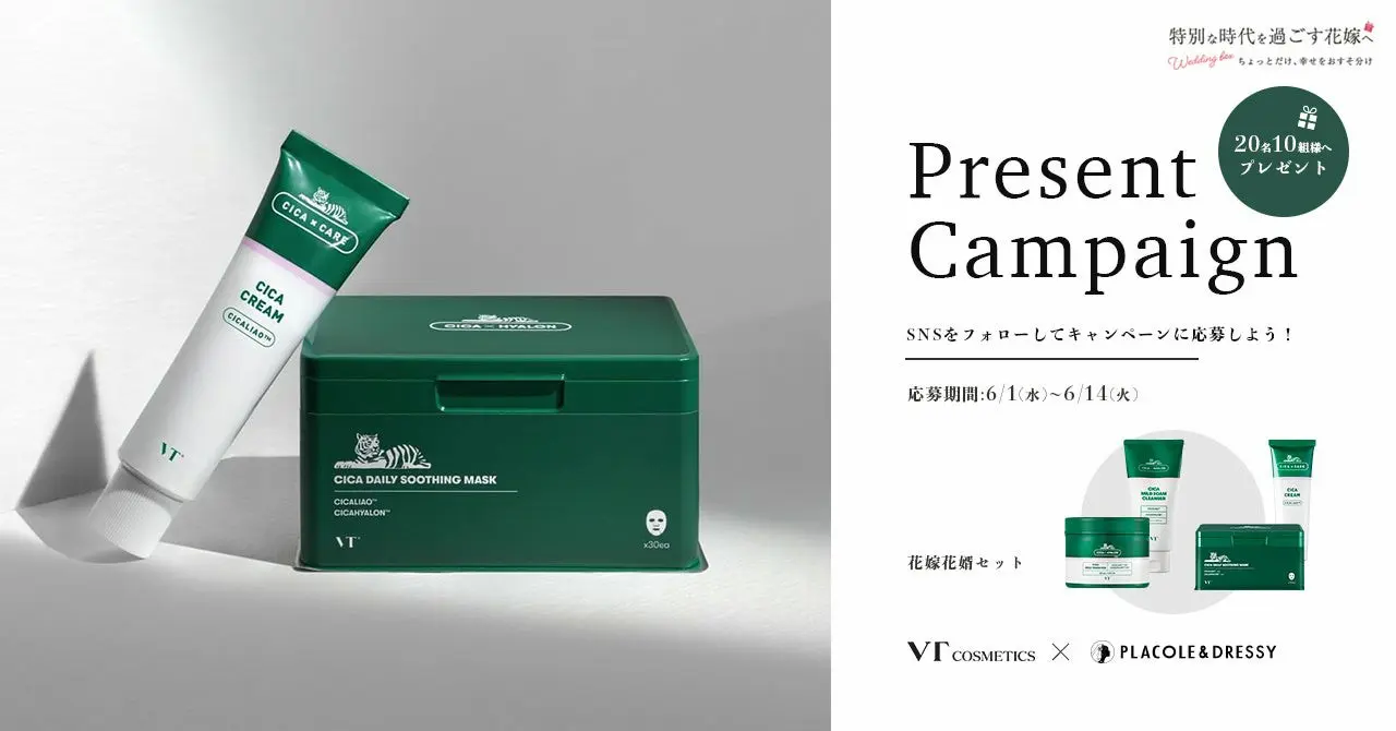 「PLACOLE & DRESSY」ブランドを展開する、冒険社プラコレ(本社:神奈川県鎌倉市、代表取締役CEO:武藤功樹)は、コロナ禍で結婚準備をすすめる花嫁に対して「特別な時代を過ごす花嫁へ」DRESSYが贈る、特別コンテンツ。第19回目となる今回は彼と一緒に使って欲しい韓国スキンケアブランド『VT COSMETICS(ブイティー コスメティックス)』の基礎スキンケアセットを10組20名様にプレゼントすることが決定しました。