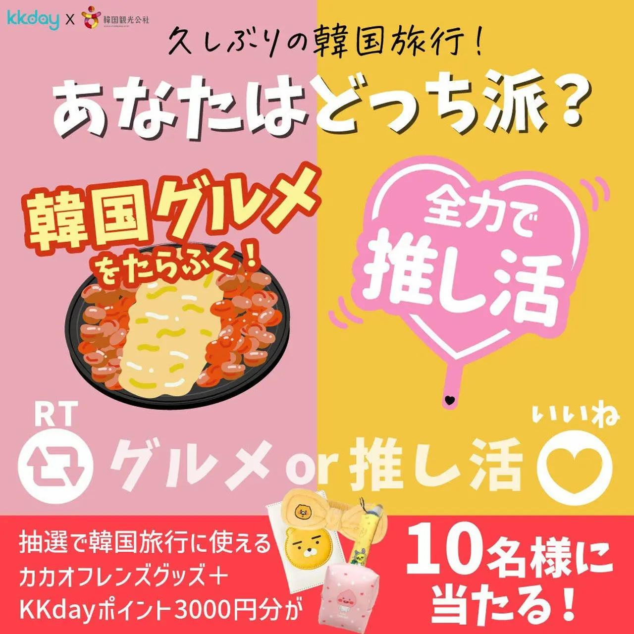 KKday Japanの公式Twitterでは、韓国観光公社東京支社公式Twitterとコラボキャンペーンを7月22日まで実施しています。KKday Japan公式Twitterのフォローとリツイートorいいねで韓国旅行でも使えるKKday旅行ポイント3000円分とカカオフレンズグッズが10名様に当たります。