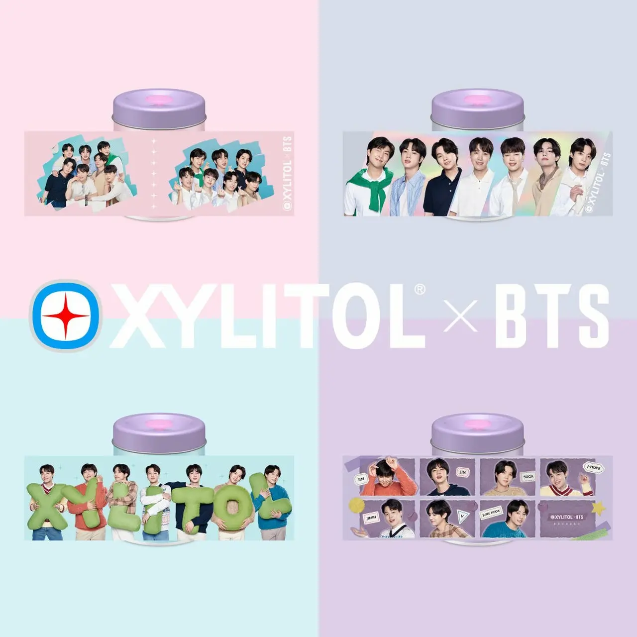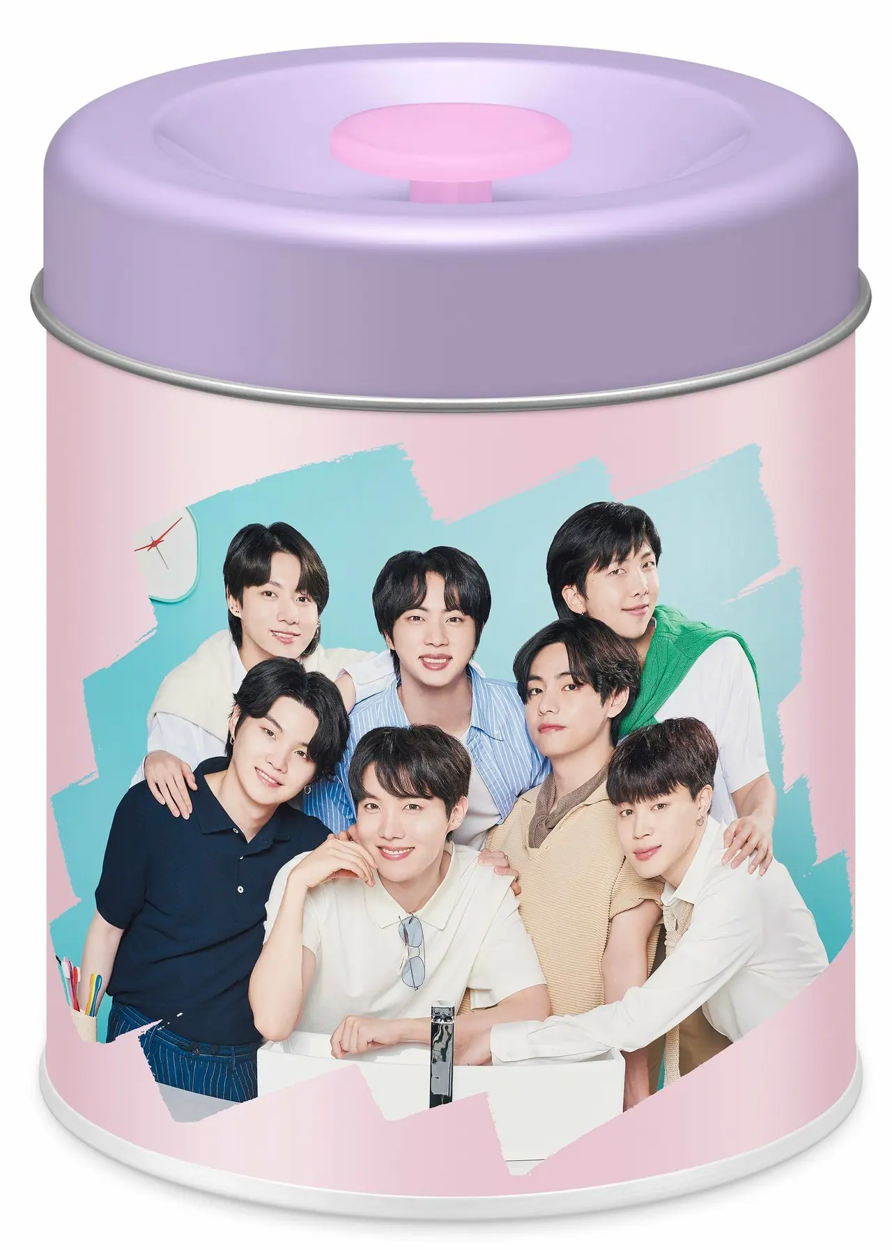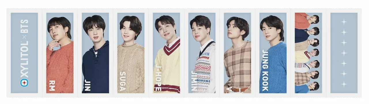 - BTSメンバー7人の笑顔が360°デザインされたプレミアム缶の中に、メンバーがデザインされた個包装のキシリトール板ガムが20枚入っています。缶のデザインは全4種類、ガムの個包装のデザインは全10種類です。