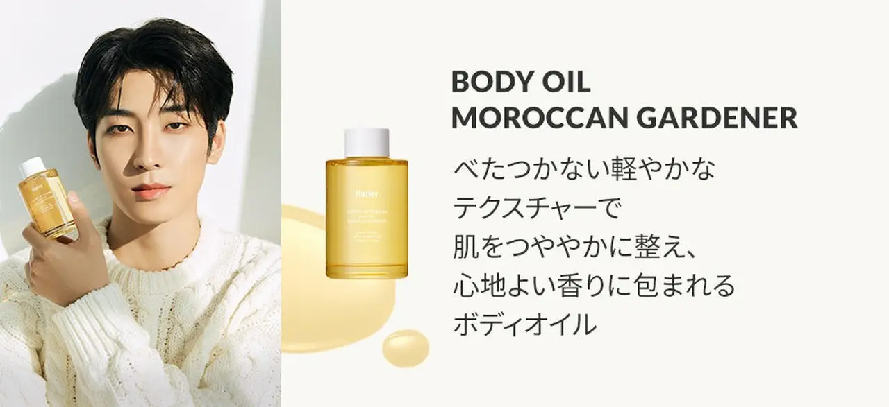 ウォヌがアンバサダーとしてイメージモデルをつとめるのは、緑を湛えるモロッコの庭園風景からインスピレーションを得た「モロッカンガーデナー」の香りのボディケア・ハンドケアシリーズ。対象となるすべての商品には、保湿力と抗酸化作用に優れたハクスリーのキー成分「ウチワサボテンオイル」を配合しています。