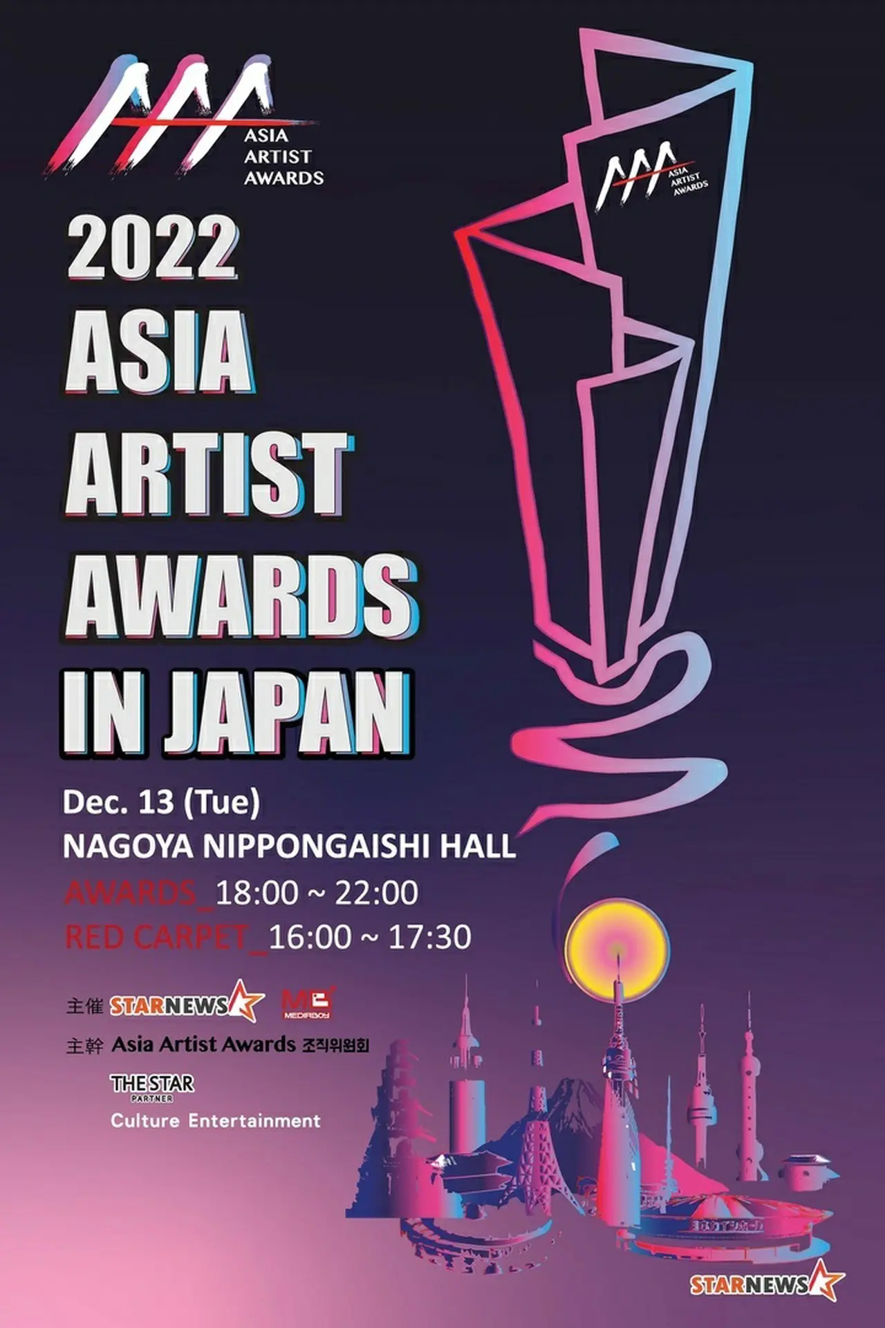 2022年12月13日(火)に名古屋にて、日本で初めて開催される「2022 Asia Artist Awards」。