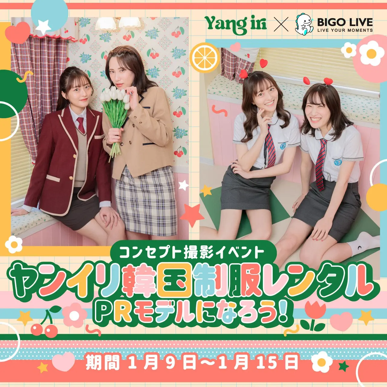 大人気グローバルライブ配信アプリ「BIGO LIVE(ビゴライブ)」を運営するBigo ServiceJapan株式会社(東京都渋谷区、URL:https://bigolive-jp.com/ja/jp/)は、国内制服レンタル業界史上最多種類!新大久保の韓国制服レンタルショップ!「ヤンイリ韓国制服レンタル」(東京都新宿区、URL: https://www.yangiri.com/)とコラボイベントと『ヤンイリ韓国制服レンタルPRモデルオーディション! 』(開催日時:2023年1月9日〜1月15日)を開催。