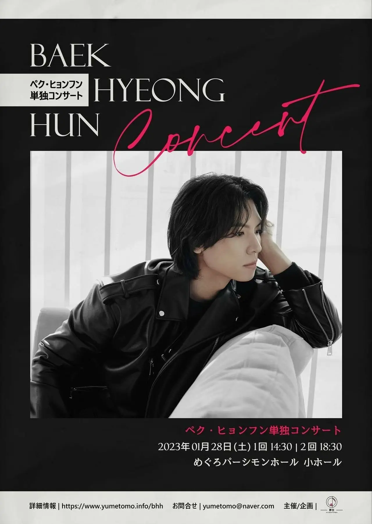 ペク・ヒョンフンは、2010年にミュージカル「ファラン」でデビュー。「女神様が見ている」、「スリル・ミー」で注目を集め、以降「エリザベート」、「ファンレター」、「ザ・デビル」、「ファントム」など、大劇場作から創作まで幅広く活躍中の韓国の人気ミュージカル俳優。今年は「キングアーサー」メレアガン役、現在はミュージカル「ジーザス・クライスト・スーパースター」でユダ役を好演中で、出演回の公演チケットは全て完売。さらに1月16日に韓国で開催される「第7回韓国ミュージカルアワード」では同公演から唯一助演男優賞にノミネートされるなど話題を集めている。そんなペク・ヒョンフンの公演直後となる今回の日本初単独コンサートは韓国のミュージカル関係者からも大きな注目を集めている。