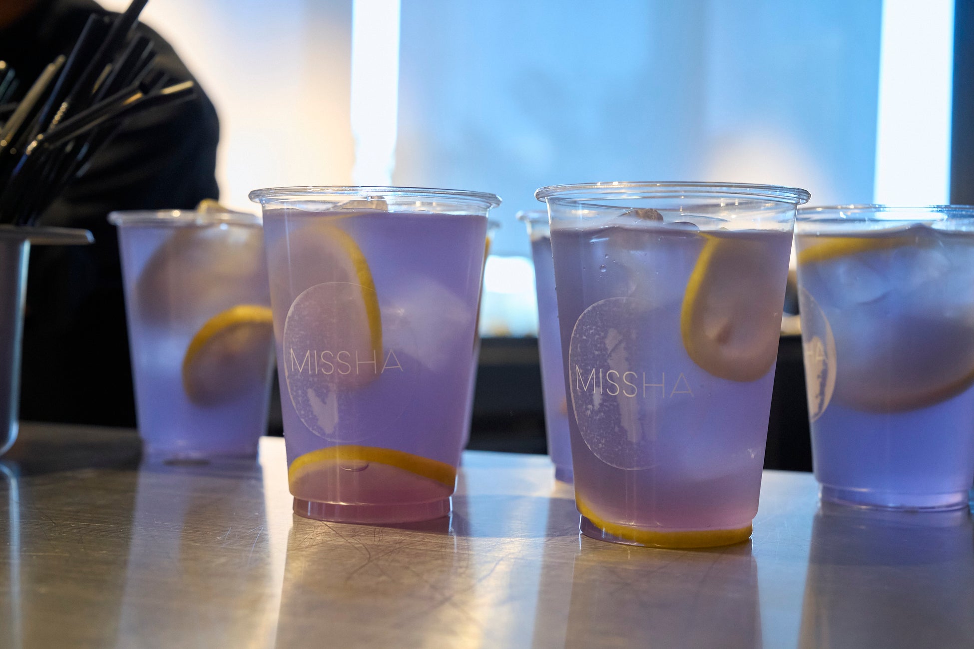 熱気に包まれた製品展示会場では、沢山の方が実際に製品を手に取りお試しいただきました。製品をイメージした涼し気なカラーのドリンクも!