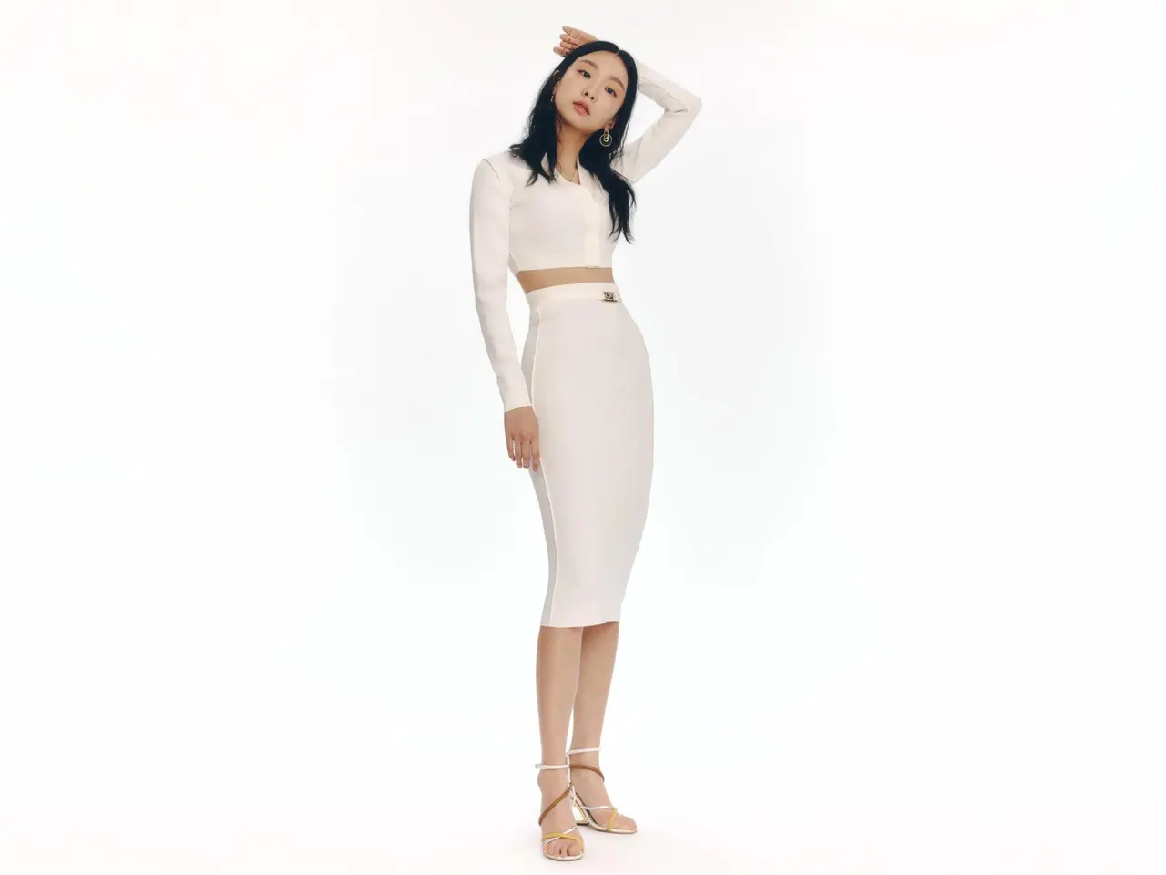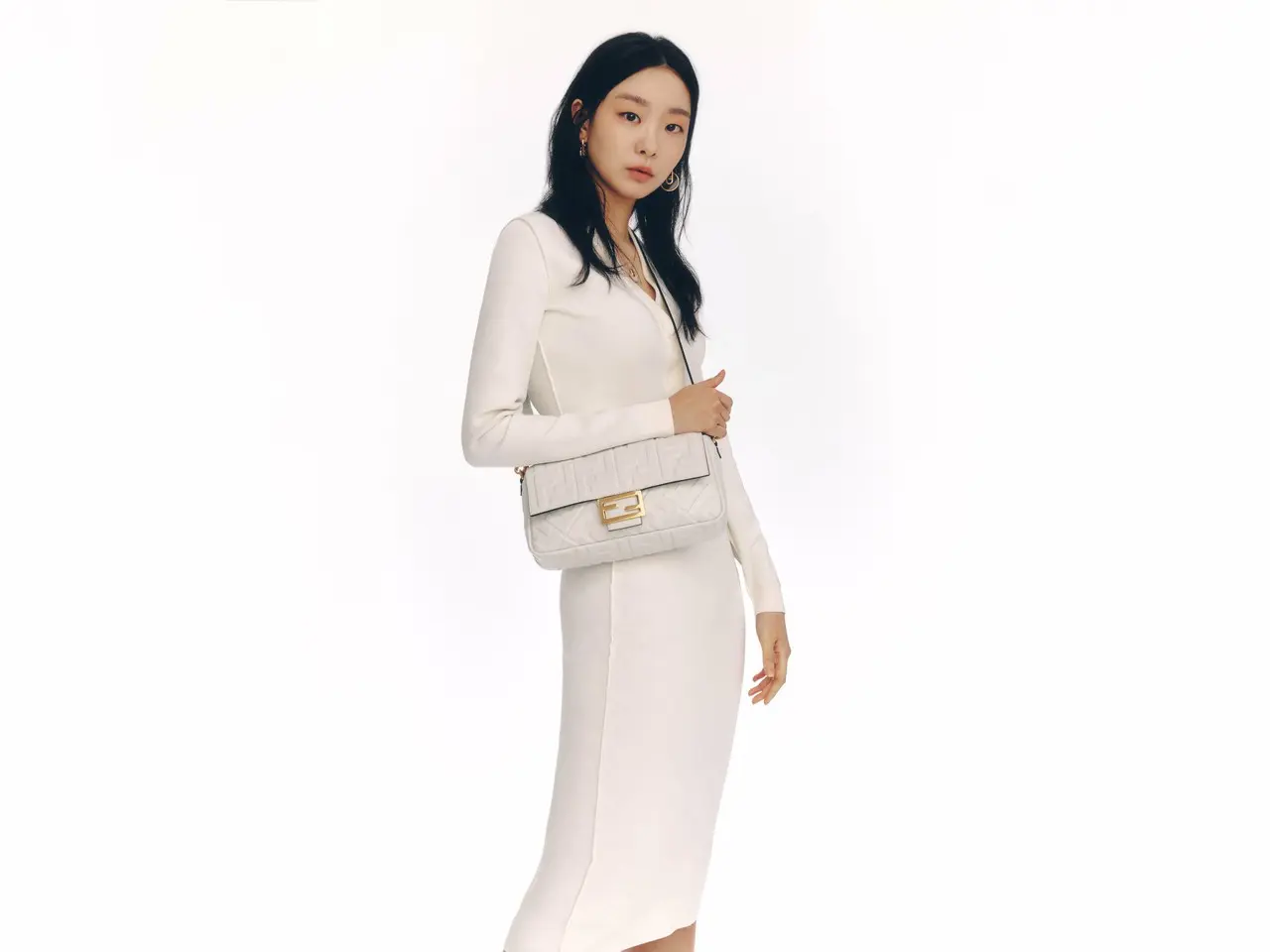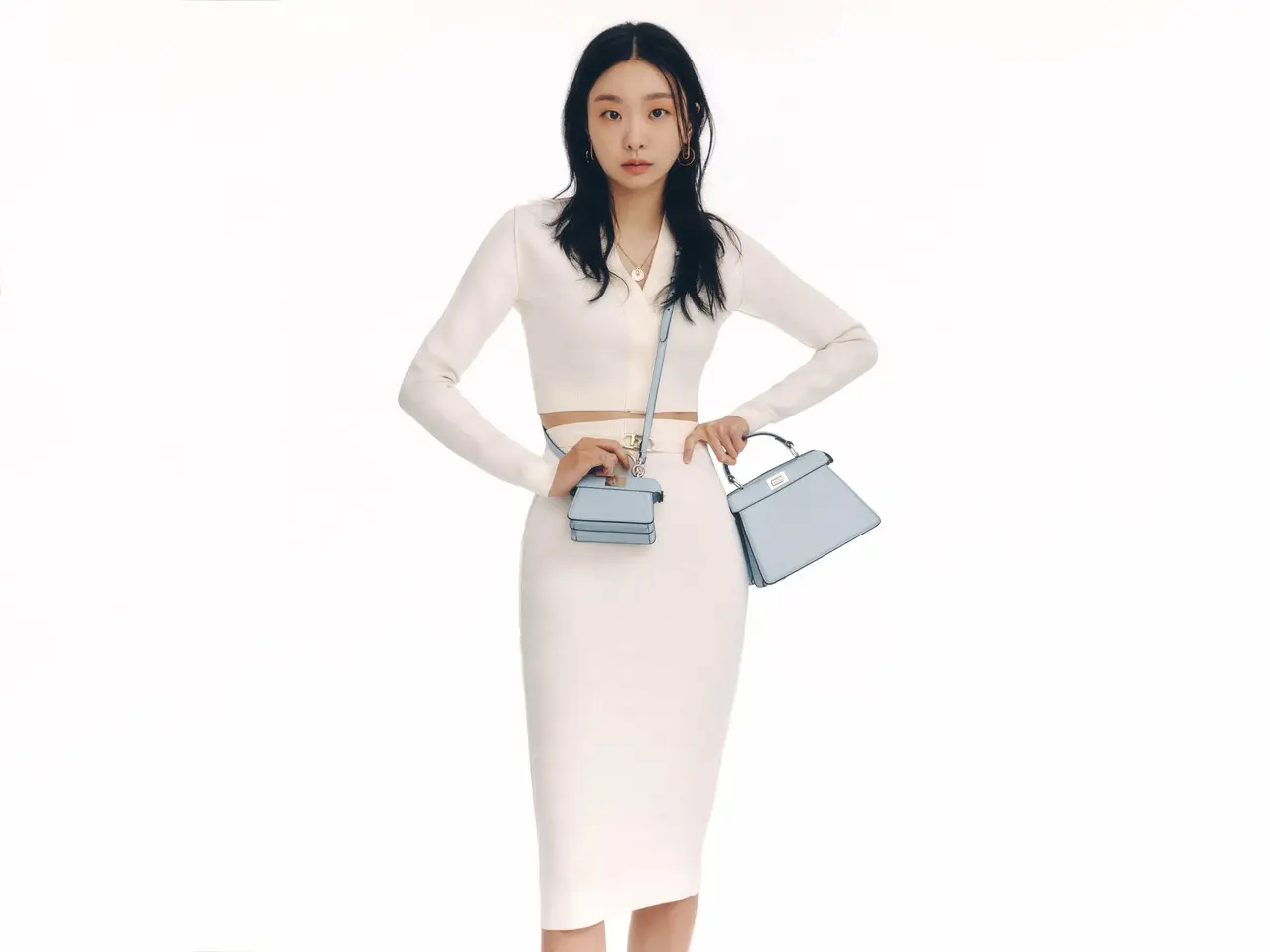 今回の就任と同時に発表されたビジュアルでは、2022年春夏ウィメンズコレクションのホワイトビスコースカーディガンとペンシルスカートのセットアップを着用。アイコニックな新作の「ピーカブー アイシーユー プチ(Peekaboo ISeeU Petite)」と「マイクロ ピーカブー(Micro Peekaboo)」、「FF」ロゴをエンボス加工であしらった「バゲット(Baguette)」を合わせて、若さあふれるエフォートレスなミレニアルスタイルを披露しています。