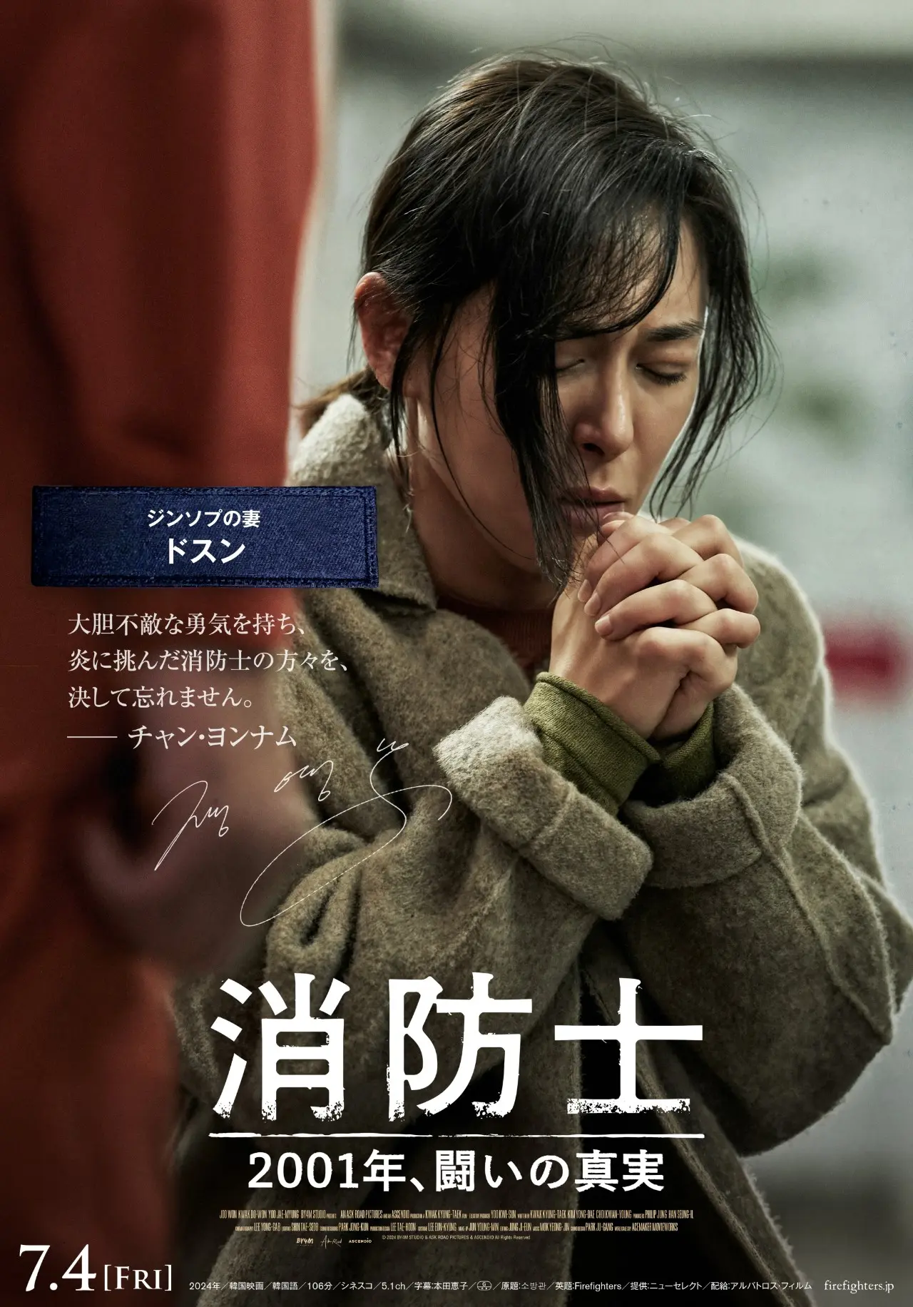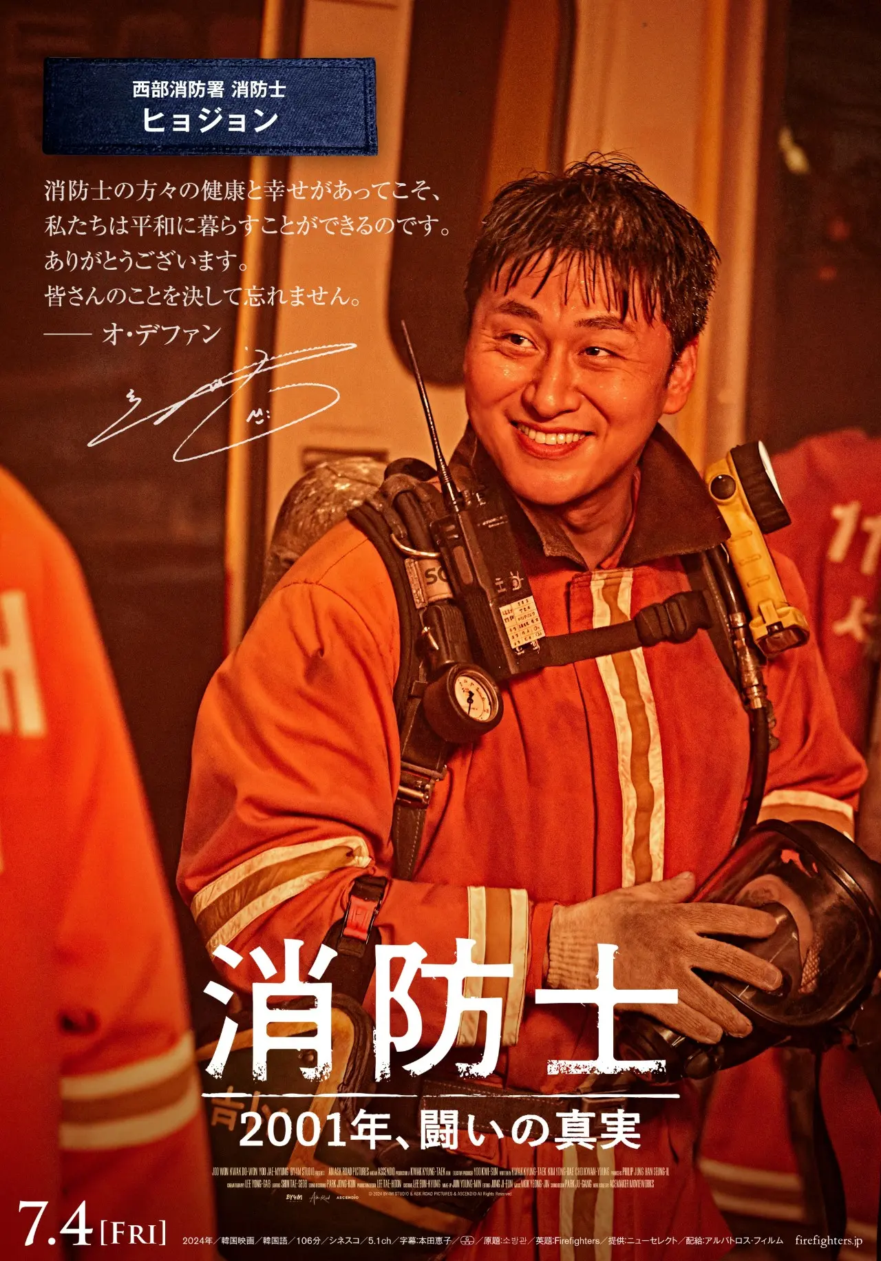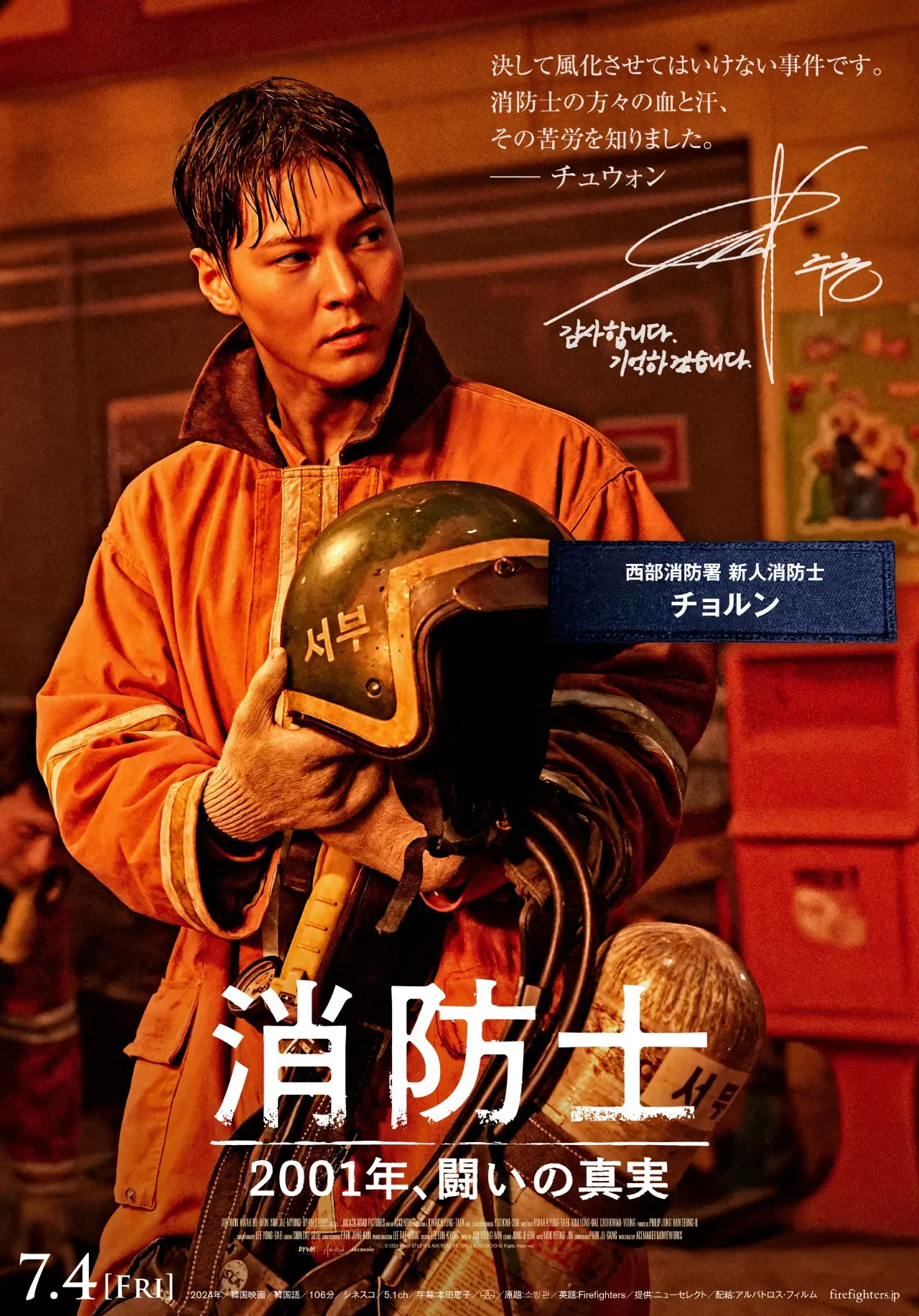 チョルンらメインキャラクター7人のポスタービジュアルが完成しました。キャラクターポスターには、本作の元になった火災惨事事件、そして消防士への方々に向けたキャストの想いの一言が入った本作ならではのビジュアルになった。