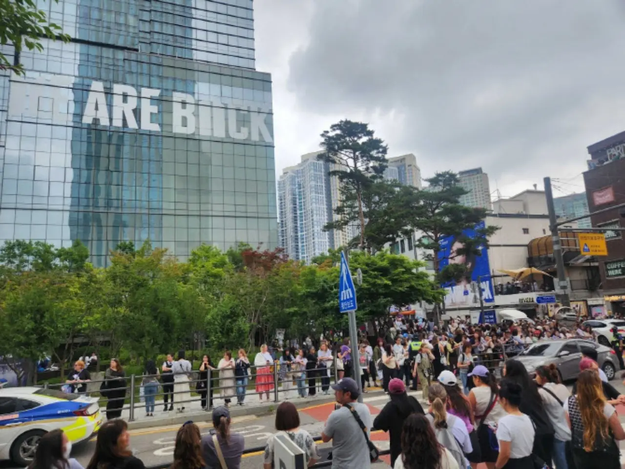 所属事務所のHYBE・BIGHIT MUSICによると、10日、「BTS」のRMとVの除隊を祝うために、ソウル・ヨンサン(龍山)区のHYBEの社屋近隣に、警察調べで約1500人あまりのファンが集まった。