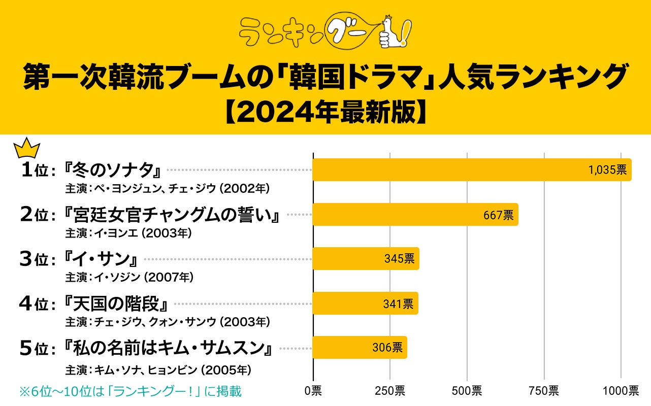 ランキングー!では第一次韓流ブームの「韓国ドラマ」をピックアップし、人気ランキングを調査。20代以上の男女(性別回答しないを含む)6,210名にアンケートを行い、TOP10を決定しました。ここではTOP5をご紹介します。