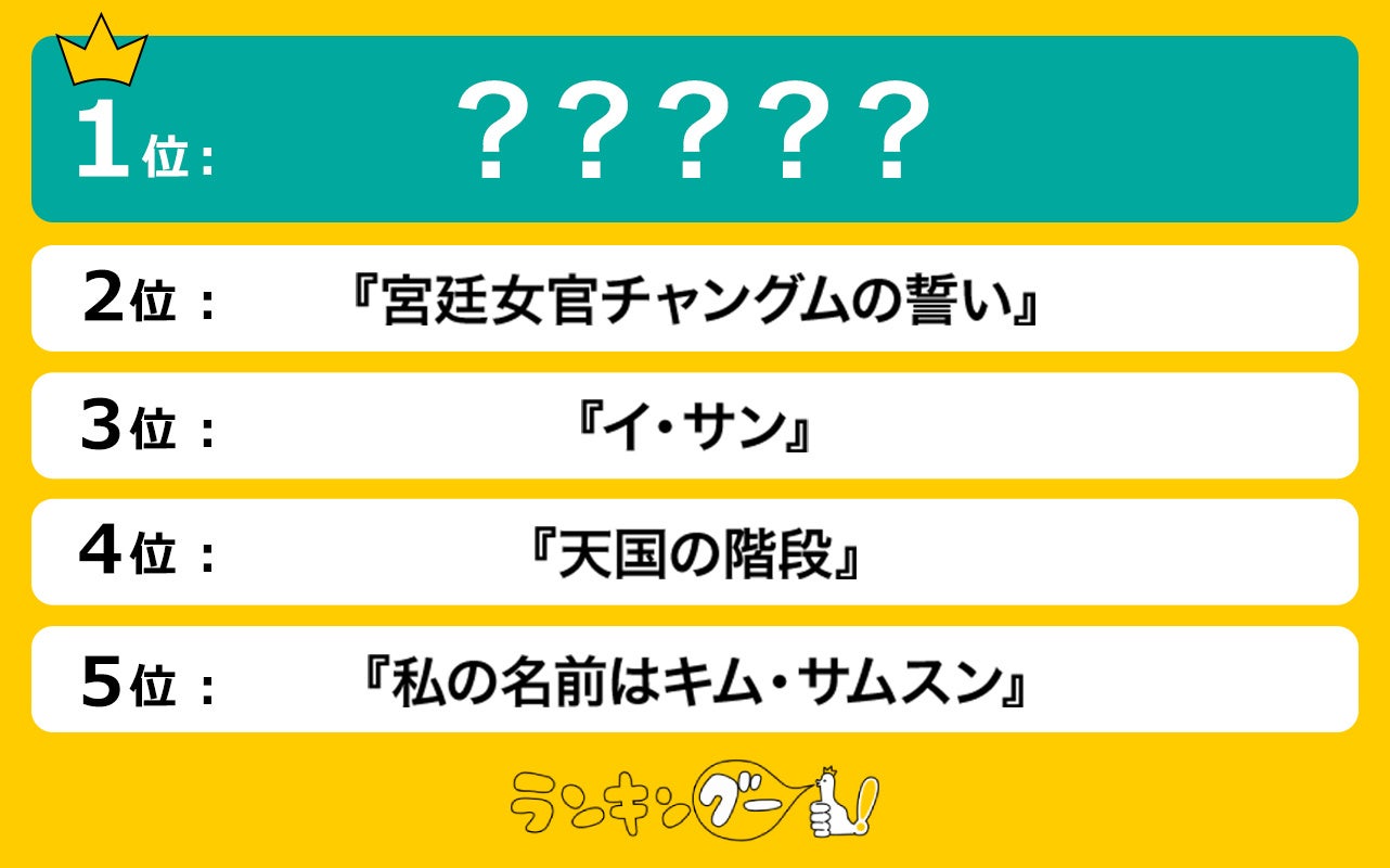 2位は社会現象を巻き起こした、韓国時代劇『宮廷女官チャングムの誓い』。3位は巨匠が手がけた超大作、『イ・サン』。僅か4票差で4位にランクインしたのは、ヒロインが切ない運命に翻弄される物語『天国の階段』。そして、5位にランクインしたのは、韓流ラブコメの『私の名前はキム・サムスン』でした。