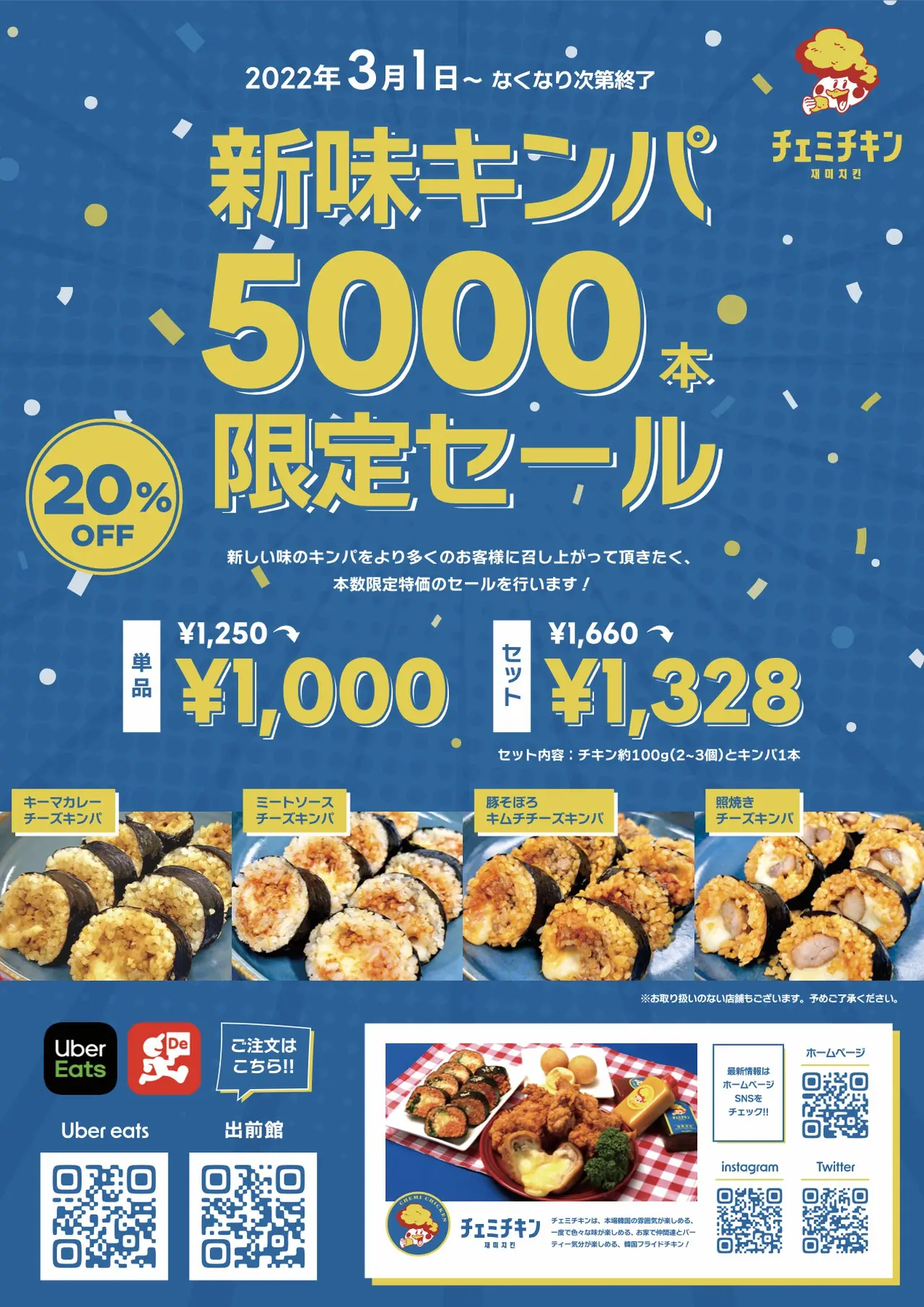 株式会社フードテックキャピタルは、韓国チキンのデリバリー専門店「チェミチキン」で2022年3月1日から「新味キンパ 5,000本限定セール」を開催します。