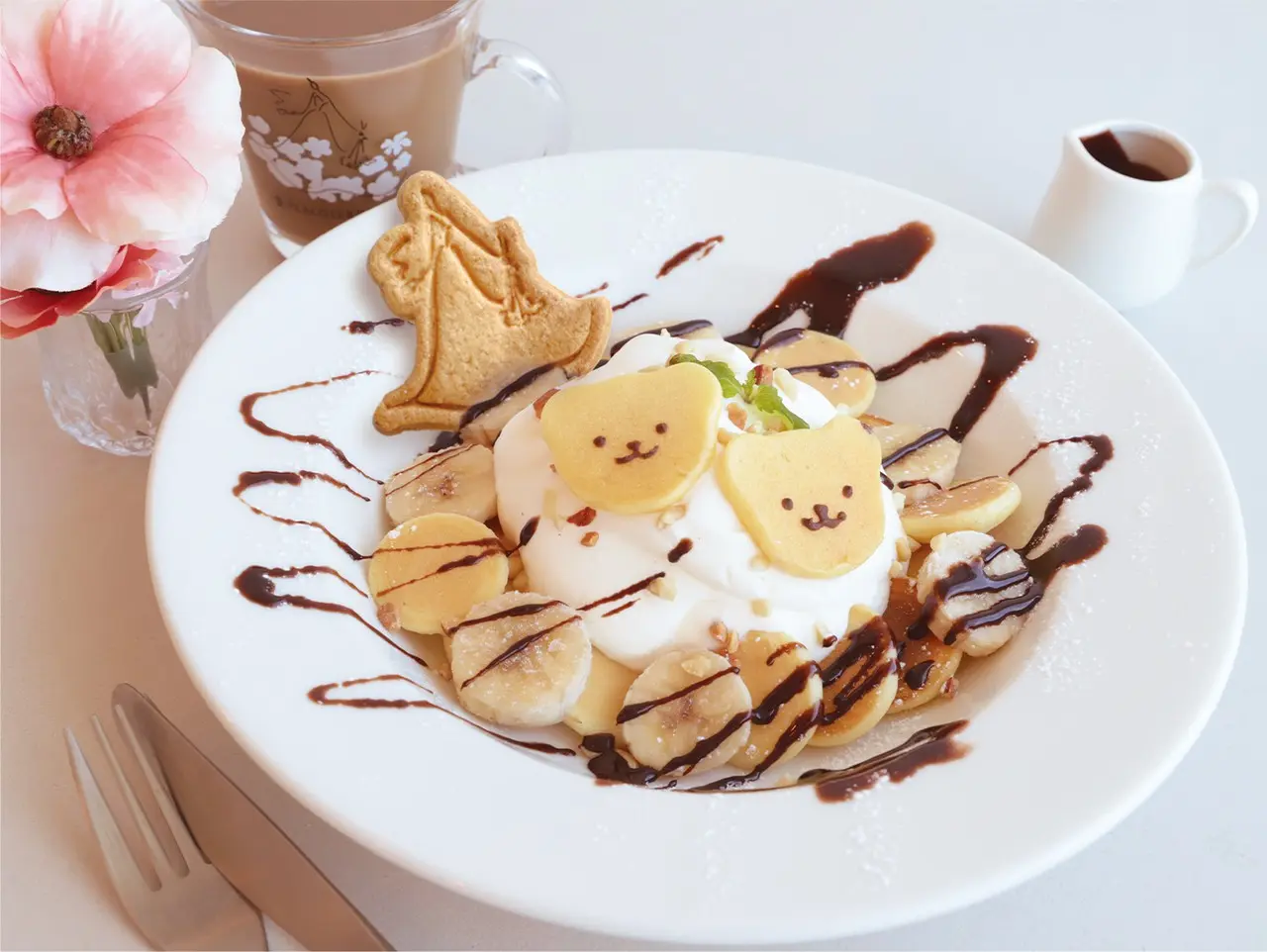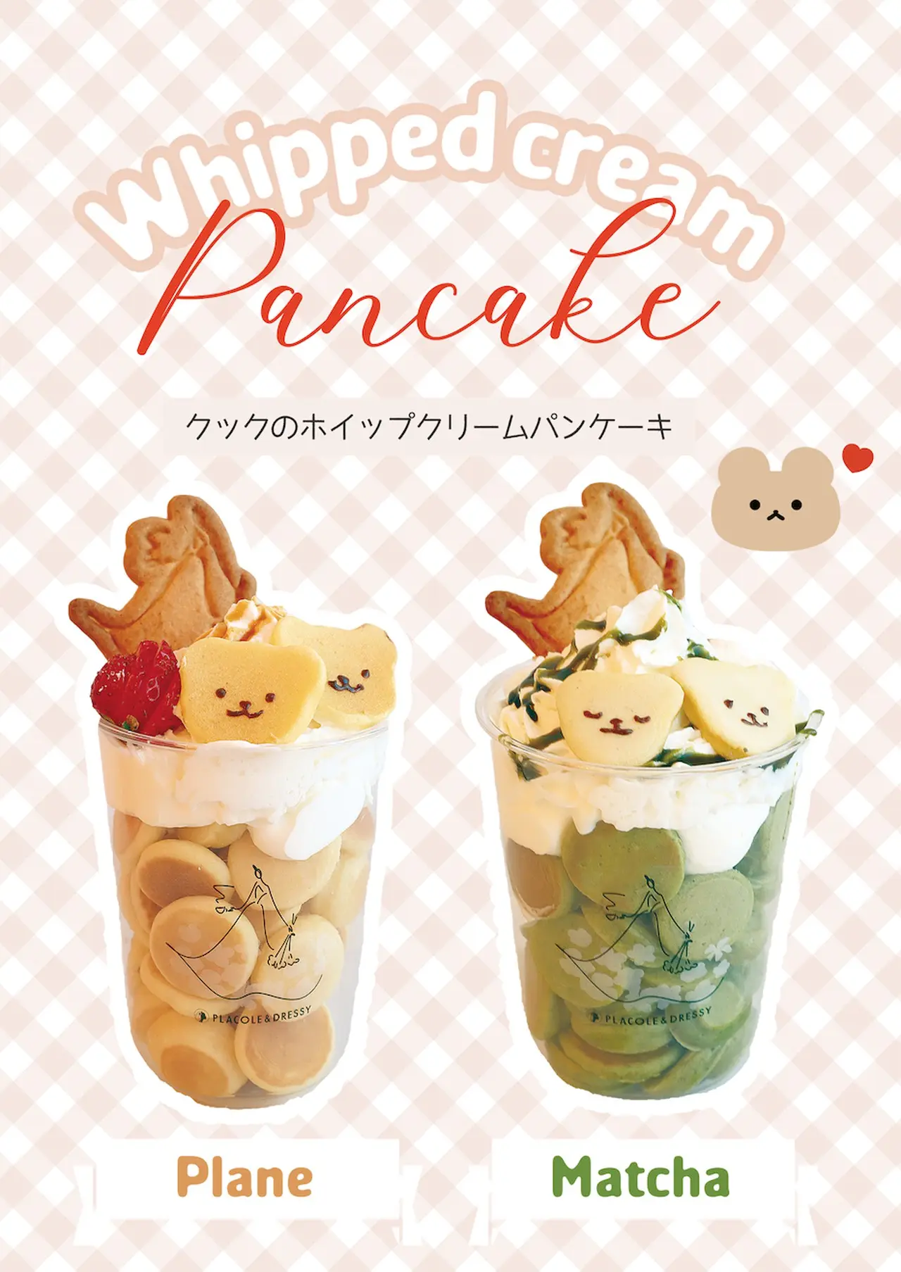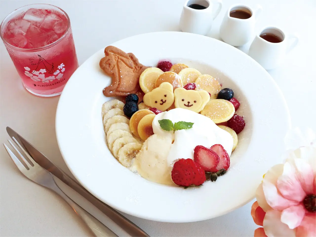甘すぎず食べやすく、デザート・ランチにもおすすめです。くま風のモチーフキャラクター「クック」のパンケーキとドレスサブレのトッピングがポイント。