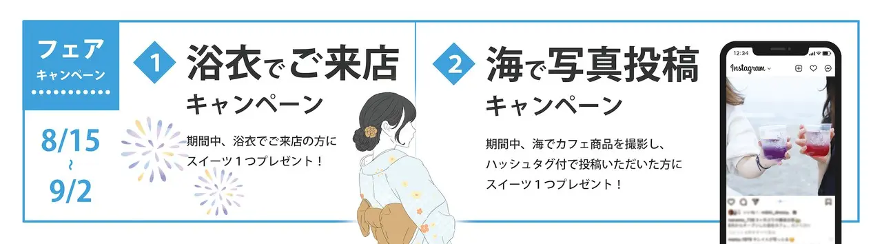 | キャンペーン内容 | 期間中、浴衣でご来店の方。又は、海でカフェ商品を撮影し、SNSに投稿いただけた方(ハッシュタグ付)にスイーツプレゼント! |