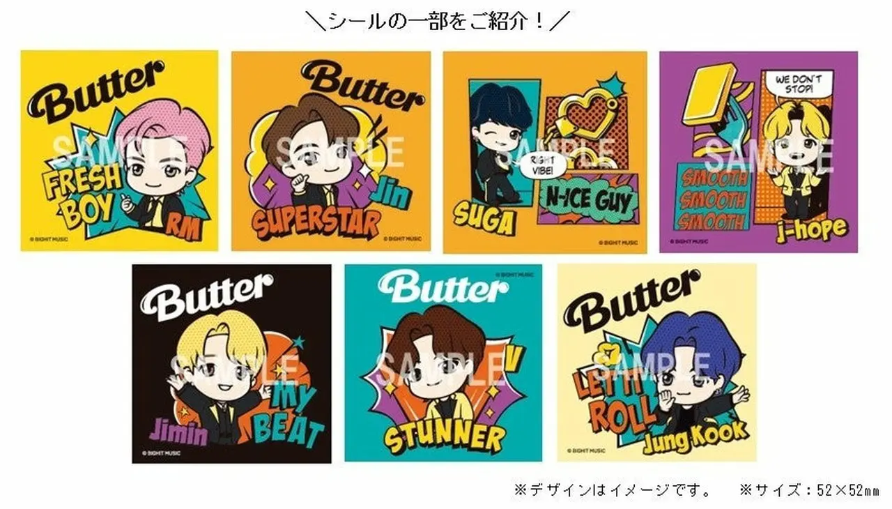 パッケージは2種類あり、世界を魅了したBTSの名曲「Butter」の衣装を身にまとったキャラクターたちのイラストを使用して展開いたします。中身は、はちみつの甘さとバターの風味が絶妙なバランスで、ほんのりと塩味がきいた甘じょっぱい味わいがクセになる、一口サイズのソフトせんべいです。