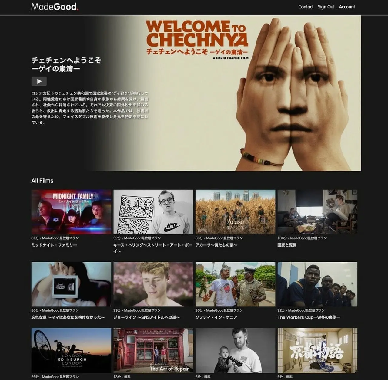 『MadeGood Films見放題プラン』は、世界中のドキュメンタリーを定額見放題でお楽しみいただける、オンライン動画配信サービスです。いつでも、どこでも、日本初上陸の良質な海外ドキュメンタリーが見放題。 コンテンツには、ユニクロTシャツでお馴染みのアーティスト「キース・ヘリング」のドキュメンタリーや、現行のロシア・ウクライナ侵攻に関連する映画『チェチェンへようこそーゲイの粛清ー』など、充実したラインナップを取り揃えています。『MadeGood Films見放題プラン』の作品はインターネットに接続したパソコン、スマートフォン、タブレットなどで視聴可能です。