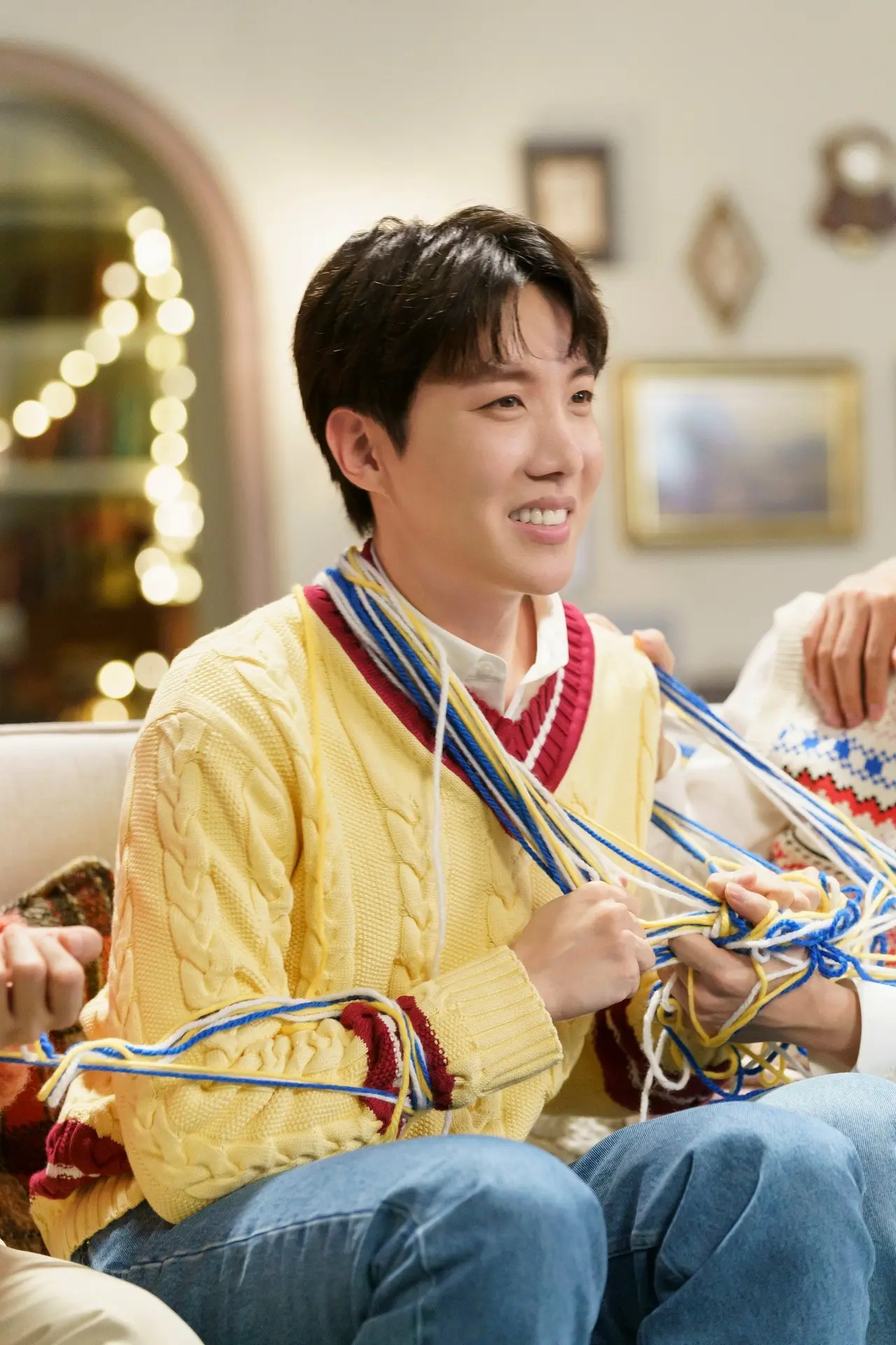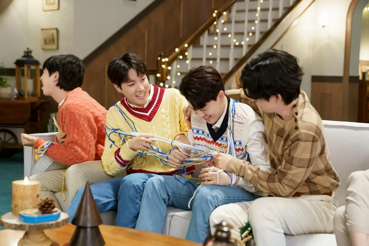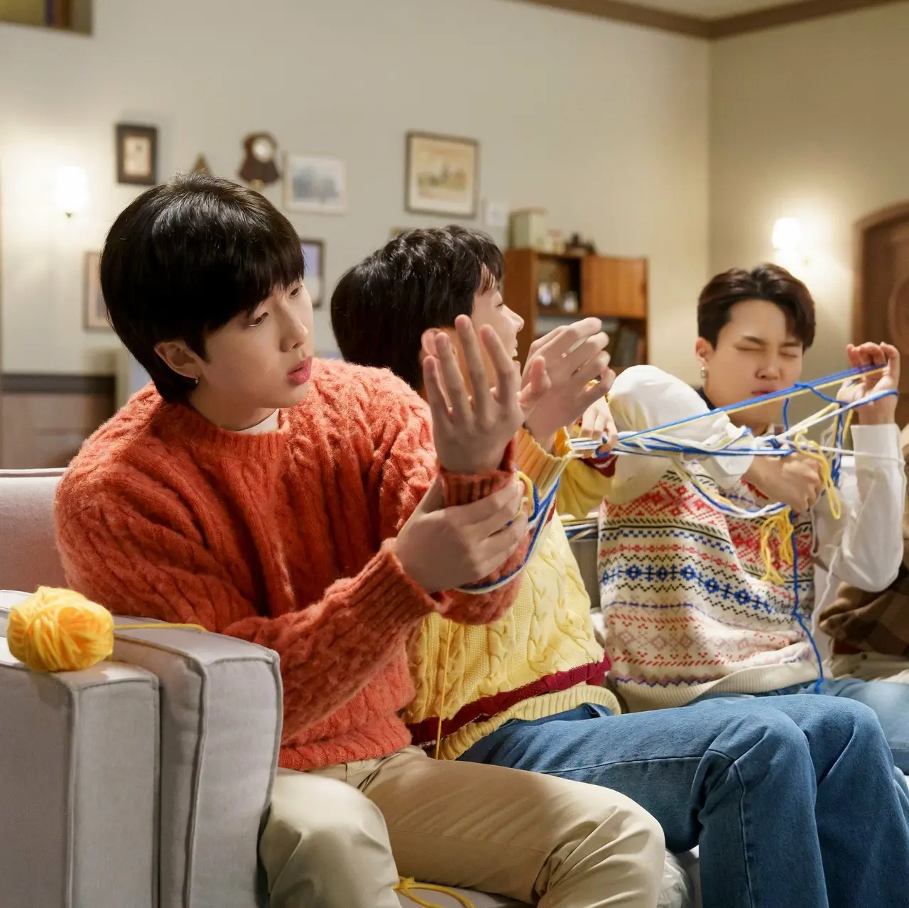 ソファに並んで座り、楽しそうに編み物をしている7人。中央に座っているVがとなりの様子がおかしいことに感づき横を見ると、J-HOPEとJIMINが何故か毛糸に絡まってしまっていました。なんとか毛糸をほどこうと、お互いが強引に毛糸を引っ張りあう2人の姿を見て、少し呆れ気味のJUNG KOOK、SUGA、そしてJIN。さらに、RMが2人を助けようとしますが、自身も巻き込まれて毛糸に絡まってしまい、やってしまったという表情を浮かべます。