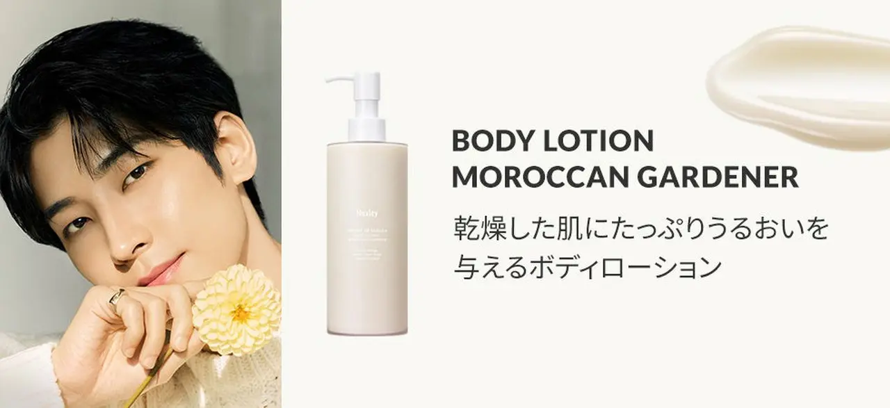ウォヌがアンバサダーとしてイメージモデルをつとめるのは、緑を湛えるモロッコの庭園風景からインスピレーションを得た「モロッカンガーデナー」の香りのボディケア・ハンドケアシリーズ。対象となるすべての商品には、保湿力と抗酸化作用に優れたハクスリーのキー成分「ウチワサボテンオイル」を配合しています。