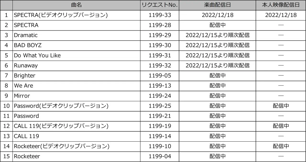 通信カラオケDAMでは、アルバム収録曲全曲を配信するほか、リード曲「SPECTRA」をビデオクリップバージョンで配信。フルアルバム収録曲のうち、4曲が本人映像で歌えます。*1