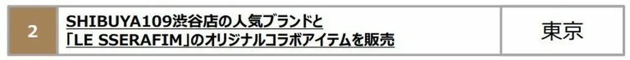 SHIBUYA109渋谷店にて、館内の人気アパレル7ブランドと「LE SSERAFIM」のオリジナルコラボアイテムを販売いたします。また、取り扱いアイテム(一部)をSHIBUYA109渋谷店2階COCO SPOTにて展示するほか、参加店舗にて対象商品をご購入いただいた方に、先着でオリジナルヘアゴムを、アイテム1つご購入毎に1つプレゼントいたします。