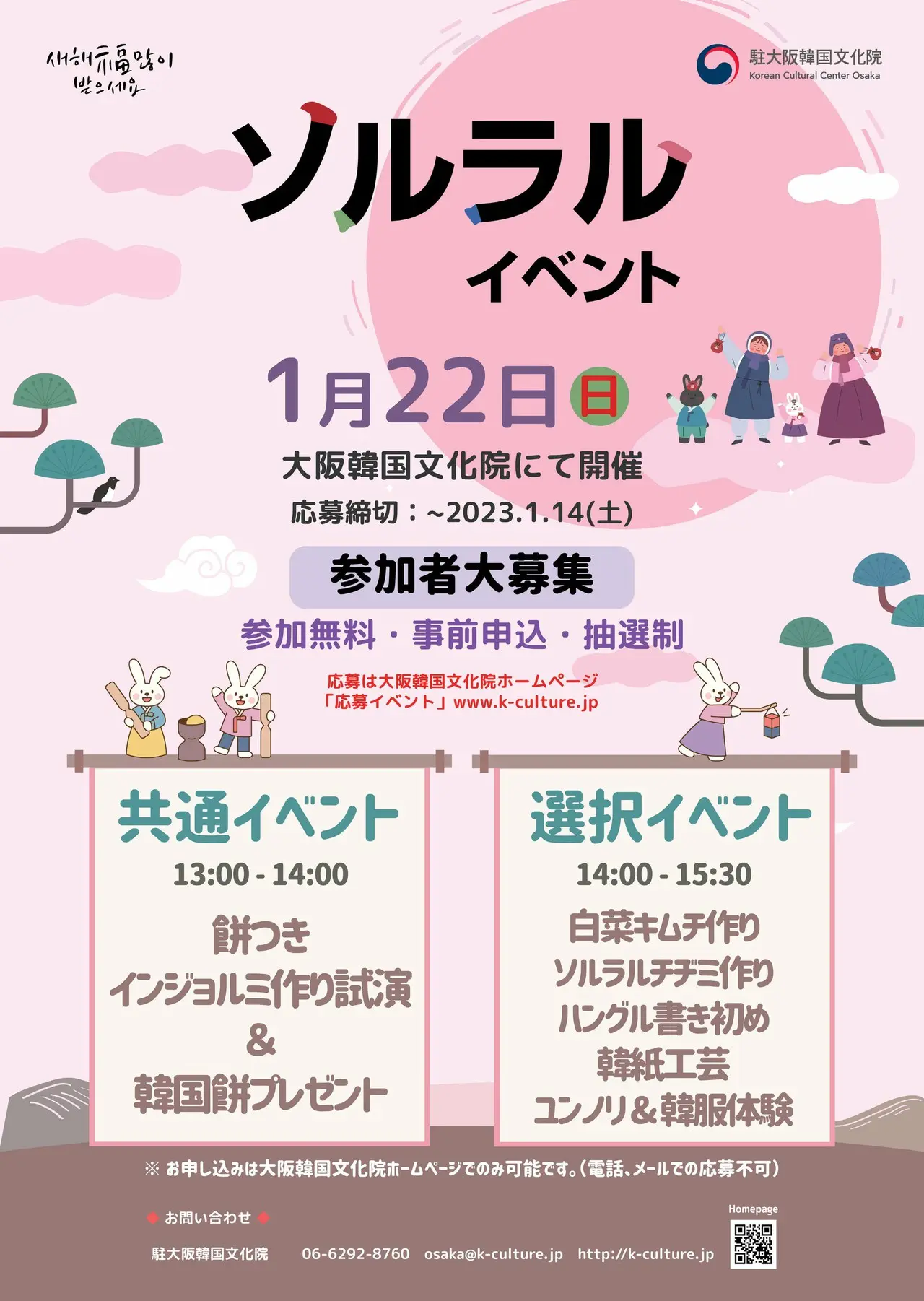 ・選択イベント: 白菜キムチ作り、ソルラルのチヂミ作り、韓紙工芸、ハングル書き初め、ユンノリ&韓服体験