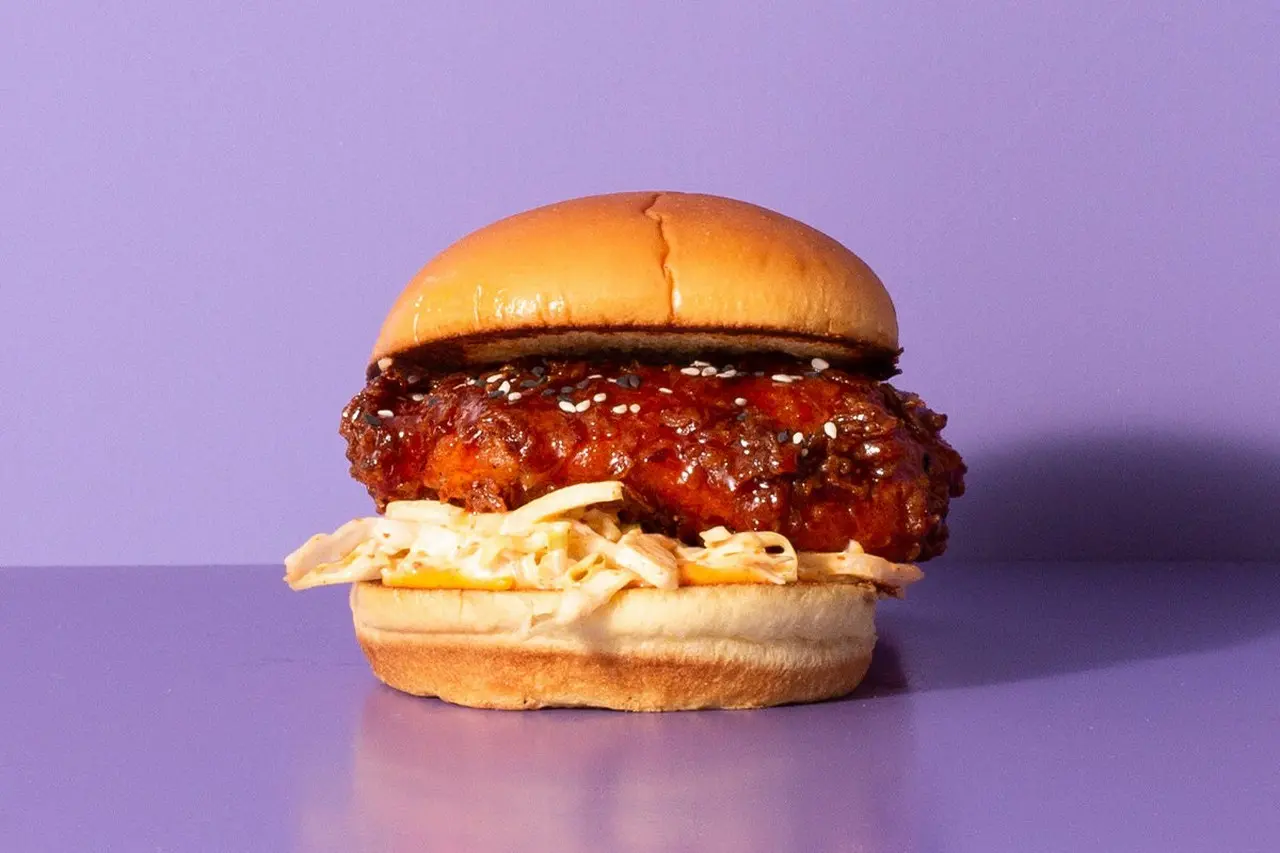 - 内容:揚げたてサクサクのチキンにコチュジャンとにんにくを使った甘辛な韓国テイストのソースを絡め、キャベツと刻みキムチを組み合わせた韓国風のコールスロー「キャベツスロー」、コチュジャンマヨ、ごまをトッピング。にんにくの香りと甘辛な韓国テイストがたまらない韓国流チキンバーガーです。