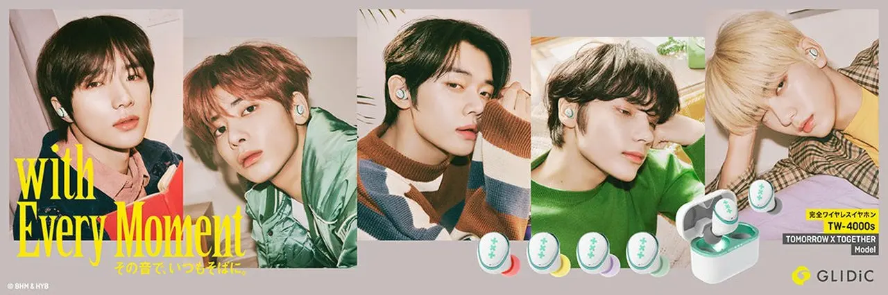SB C&S株式会社は、「動くひとの、音」をブランドスローガンに掲げたモバイルのためのオーディオブランド「GLIDiC(グライディック)」の完全ワイヤレスイヤホン「GLIDiC TW-4000s」のタイアップアーティストとして、人気K-POPグループTOMORROW X TOGETHERを再び起用します。今回のテーマは、「with Every Moment その音で、いつもそばに。」。GLIDiCがかなえる「どんな瞬間も好きな音楽がそばにいる体験」を、日常の中でリラックスした表情を見せるTOMORROW X TOGETHERメンバーと描きます。そして今回は、TOMORROW X TOGETHERとの初のコラボレーションモデル「GLIDiC TW-4000s【TOMORROW X TOGETHER Model】」を2023年2月24日から発売します。