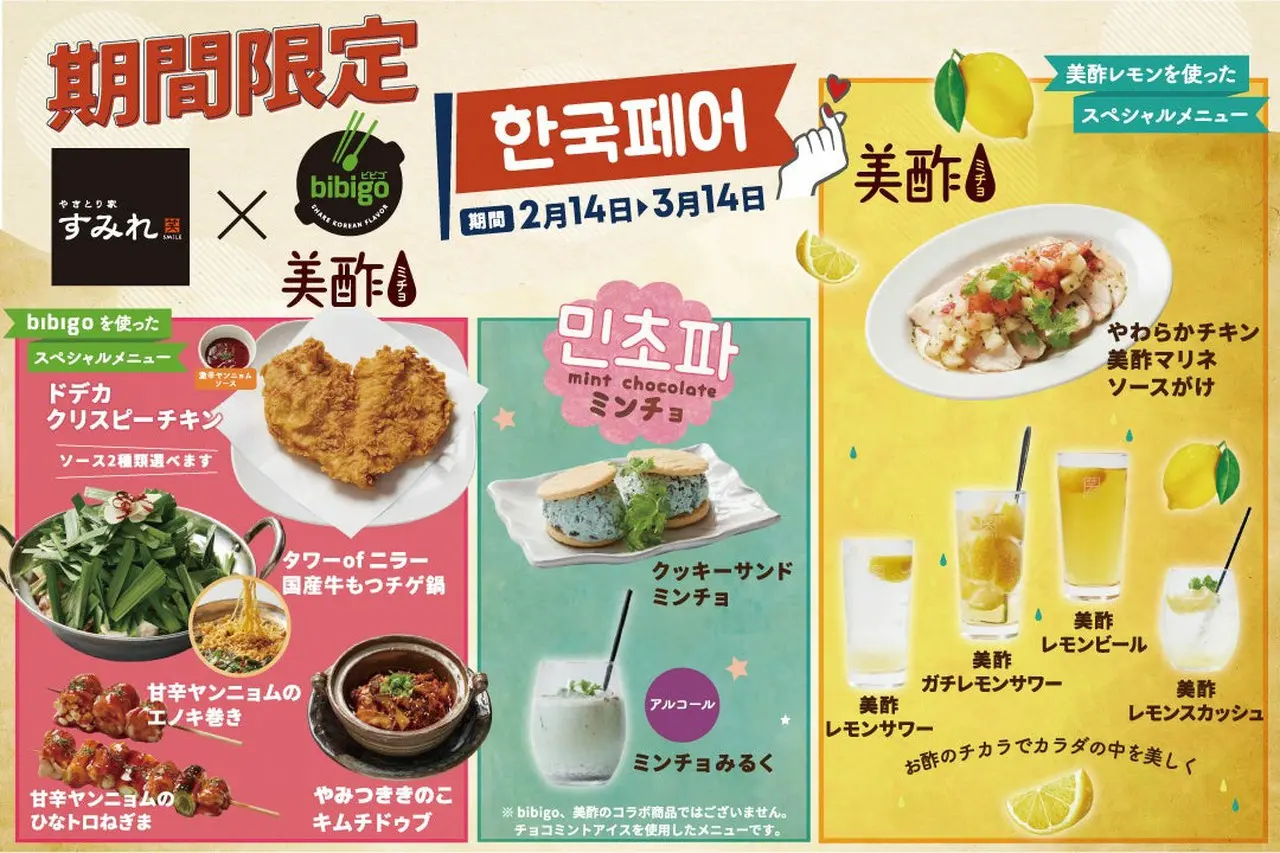 株式会社すみれ(所在地:東京都渋谷区/代表取締役:湯澤忠則)が運営する「やきとり家すみれ」は、“美酢・bibigo”と初のコラボメニューを2023年2月14日(火)から79店舗で期間限定販売いたします。「韓国から、美味しいまごころを。」をテーマに果実のお酢”美酢”・グローバル韓国料理ブランド”bibigo”とのコラボメニューは、焼き鳥専門店のすみれだからこそ、ドデカクリスピーチキンや甘辛ヤンニョムひなトロねぎまなど鶏料理をメインに韓流グルメで旅気分が味わえます。
