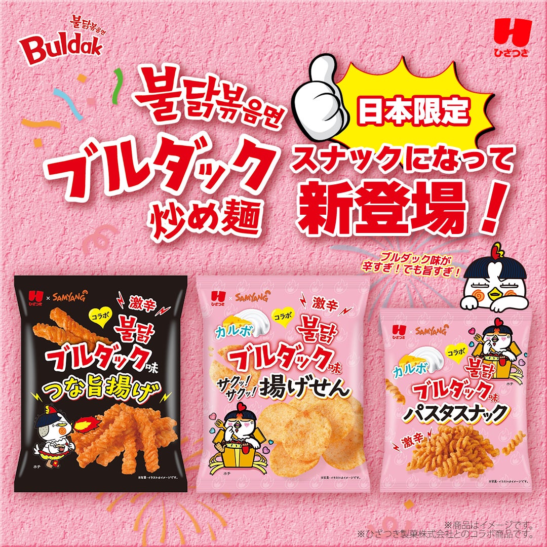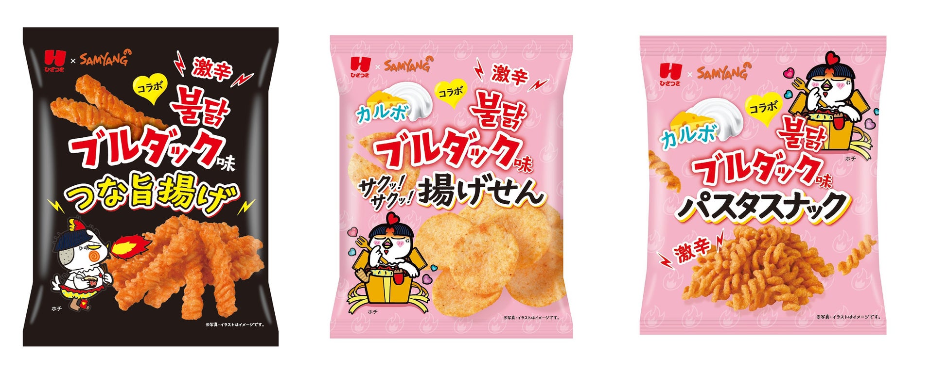 株式会社三養ジャパン(東京都新宿区 代表取締役:洪 範準、以下 三養ジャパン)とひざつき製菓株式会社(本社:栃木県栃木市、代表取締役社長:膝附 武男、以下 ひざつき製菓)は、三養ジャパンの大人気激辛シリーズ「ブルダック」をイメージした米菓『ブルダックつな旨揚げ』『ブルダックサクサク揚げせんカルボナーラ味』『ブルダックパスタスナックカルボナーラ味』をコラボレーションにより商品化、ひざつき製菓から2023年5月上旬より全国のセブン-イレブンにて先行販売いたします(6月より全国のコンビニ・スーパーにて一般発売予定)。
