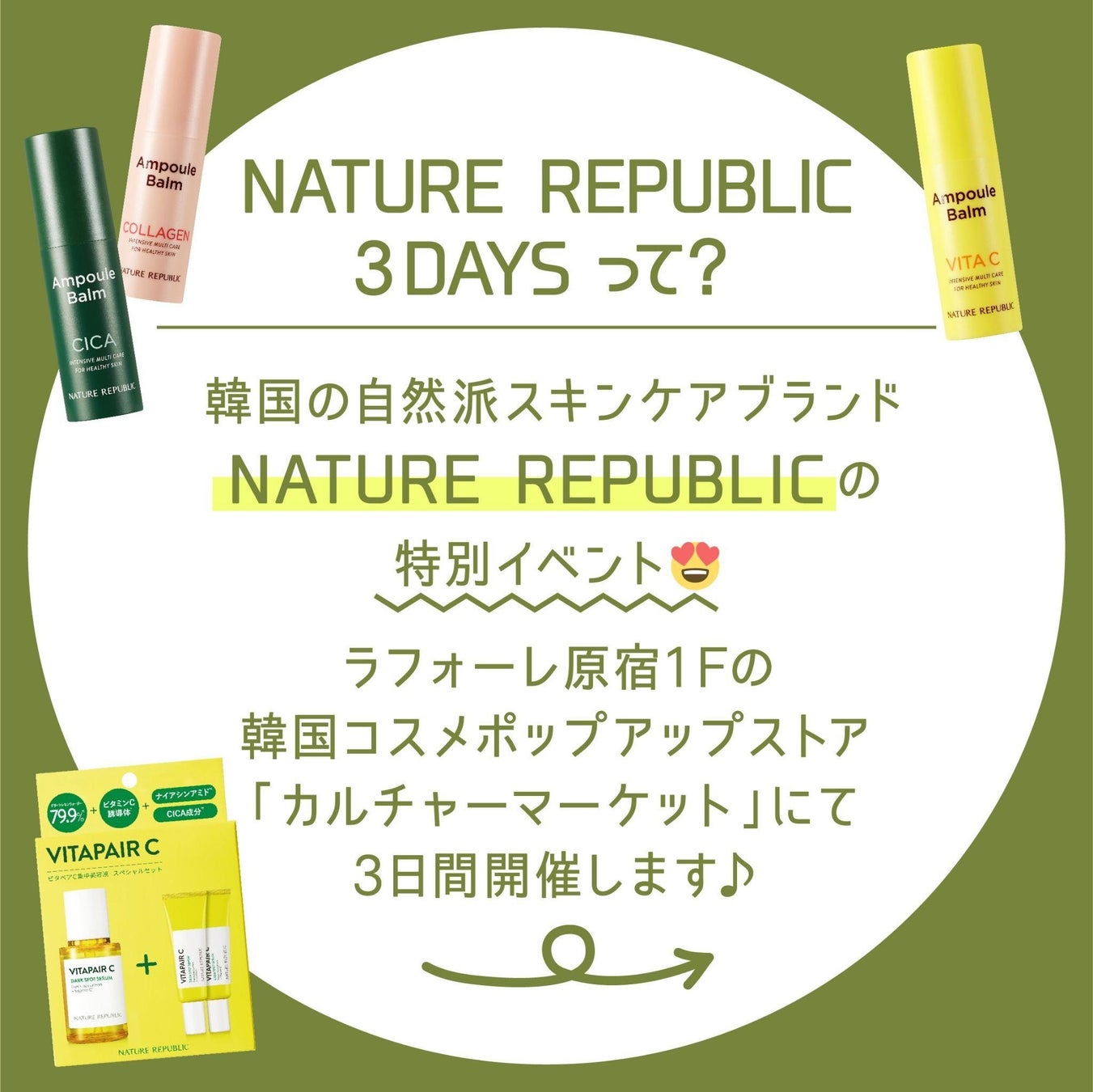 韓国自然派スキンケアブランド「ネイチャーリパブリック」が、ラフォーレ原宿1階の韓国コスメポップアップストア「Kulture Market Supported by Rakuten(カルチャーマーケット)」にて特別イベントを5月19日(金)~5月21日(日)*開催いたします。