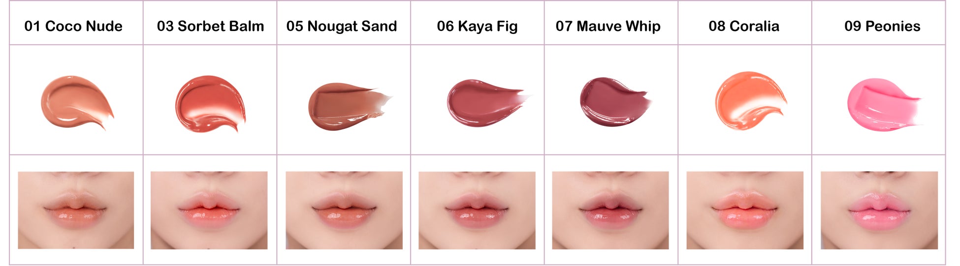 ウォームトーン向けのライトコーラルとクールトーン向けのライトピンクはどちらも白みを含んだ色合いで、鮮やかなツヤリップをお楽しみいただけます。