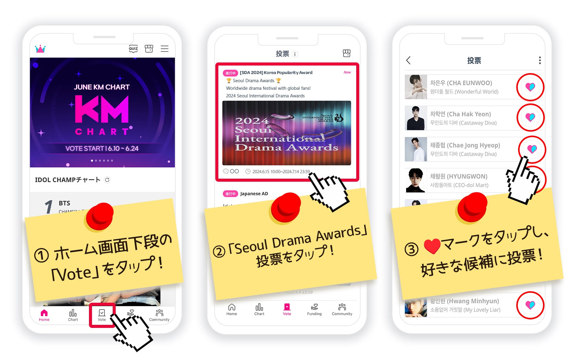 IDOLCHAMPアプリから『Seoul Drama Awards』の投票ページにアクセスし、好きな候補に投票