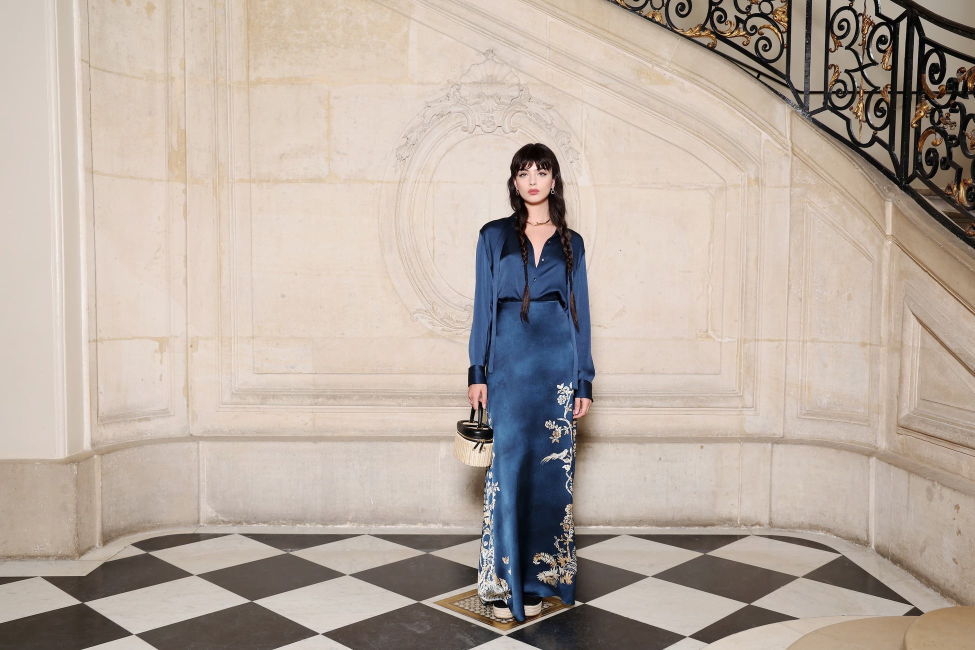 ディーヴァー・カッセルは、2024年フォール コレクションからブルーのプリントシルクシャツとスカートを纏い、バッグとシューズを合わせました。