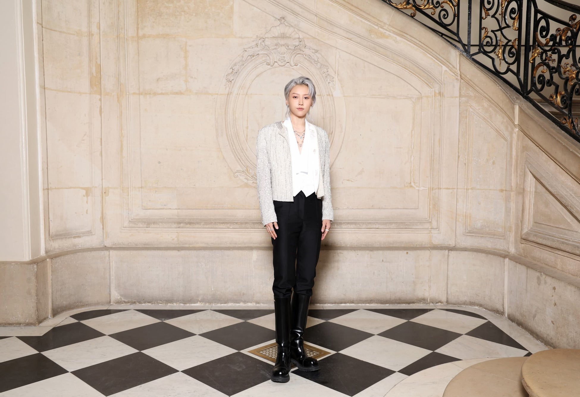 リュウ・ユーシンは、2024年フォール コレクションから刺繍があしらわれたウールとシルクのジャケット、ホワイトのシルクベスト、ブラックのウールシルクのパンツを纏い、同色のブーツを合わせました。