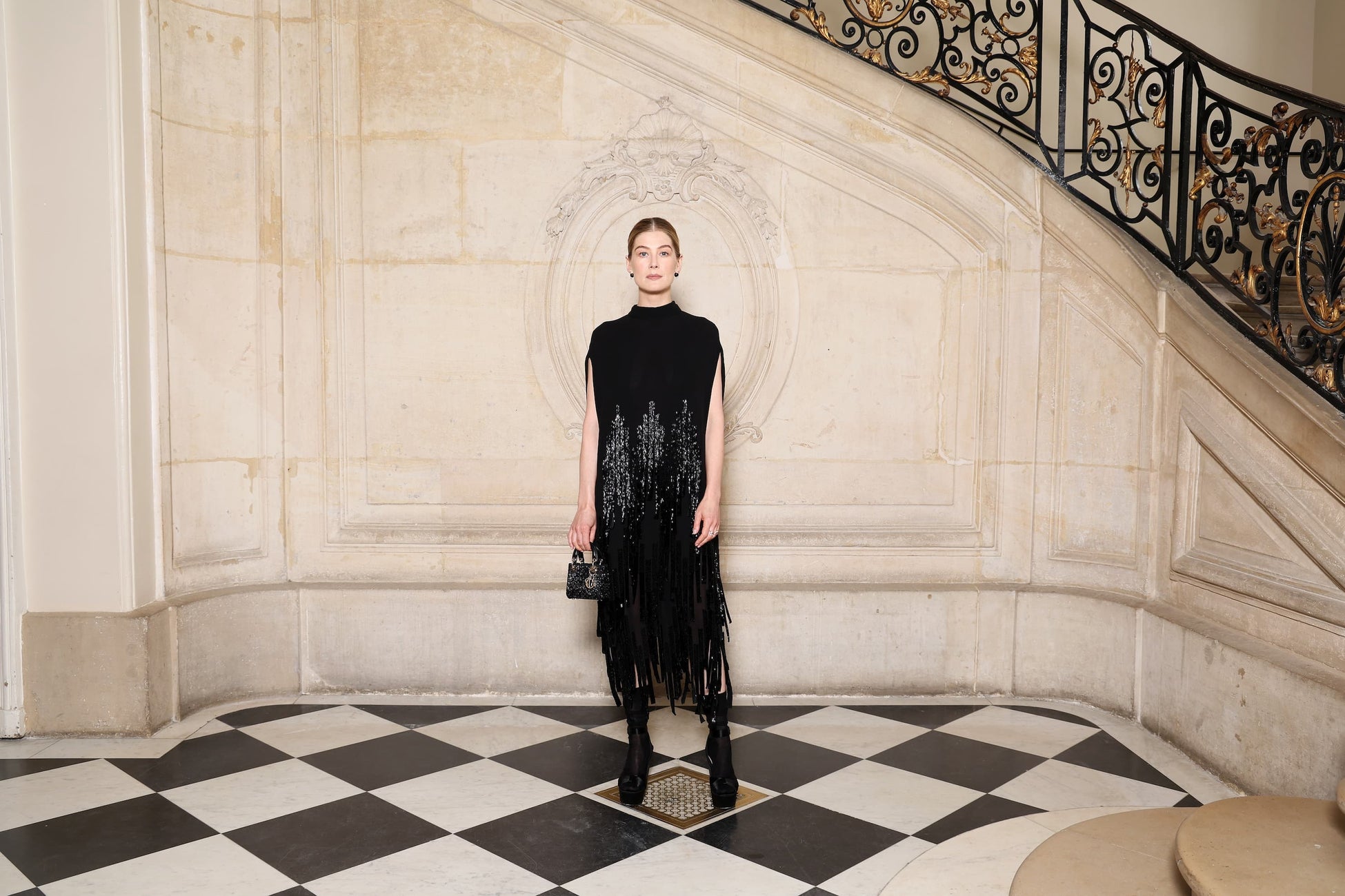 ロザムンド・パイクは、2024年フォール コレクションから刺繍があしらわれたウール素材のドレスを纏い、「レディ ディオール」バッグにソックス、シューズを合わせました。