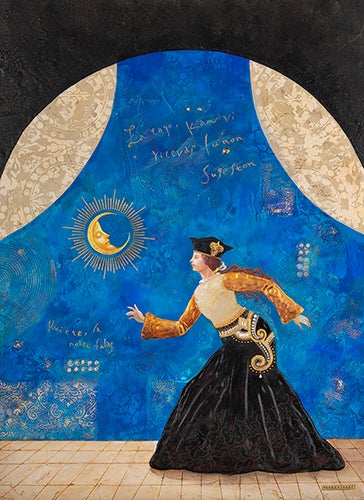 下地に石膏やセメントを用い、アンティークレースなどをコラージュした古典的なフレスコ画の雰囲気を醸し出した特徴のある立体的な絵画となっています。