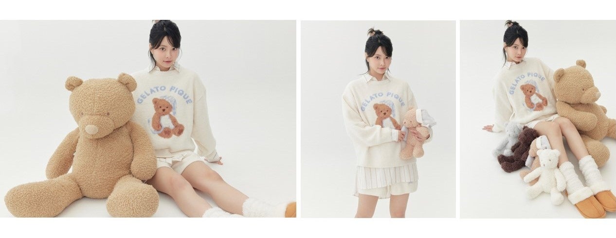 ナイトキャップをかぶっておやすみの準備をしているベアをモチーフにした、見ているだけで癒されるコレクション。ふんわりと柔らかい素材のニットウェアや、枕を抱えたお座りポーズが愛らしいぬいぐるみが登場。ベアと一緒に心地よいおやすみタイムを。