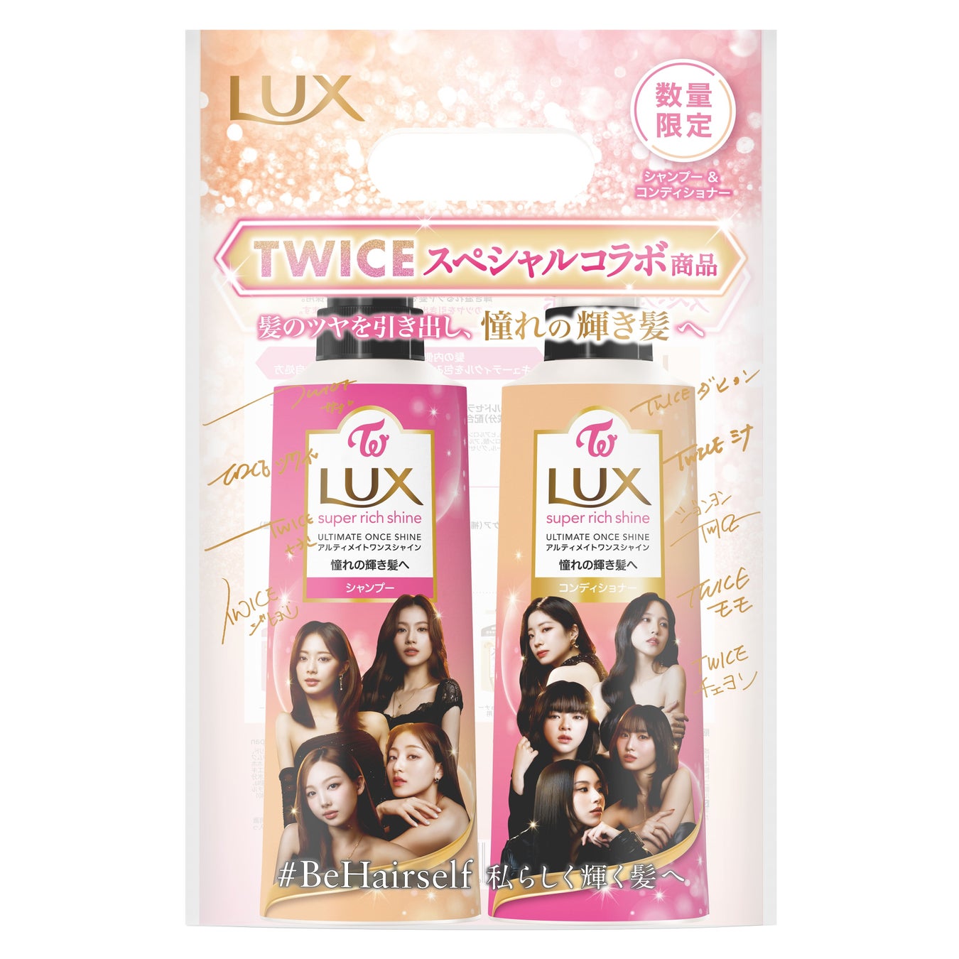 新登場のコラボボトル『ラックス スーパーリッチシャイン アルティメイトワンスシャイン TWICE限定デザイン ポンプペア』には、リッチゴールドセラム※2に加え、今回初登場となるシャイニングスターエキス※1配合処方で、内側から輝く憧れのツヤ髪へ導きます。さらに、独自処方でツヤ・インナーケア(補修・保湿)・アウターケア(補修・保湿)・うるおい・うねりケア※3を叶えます。