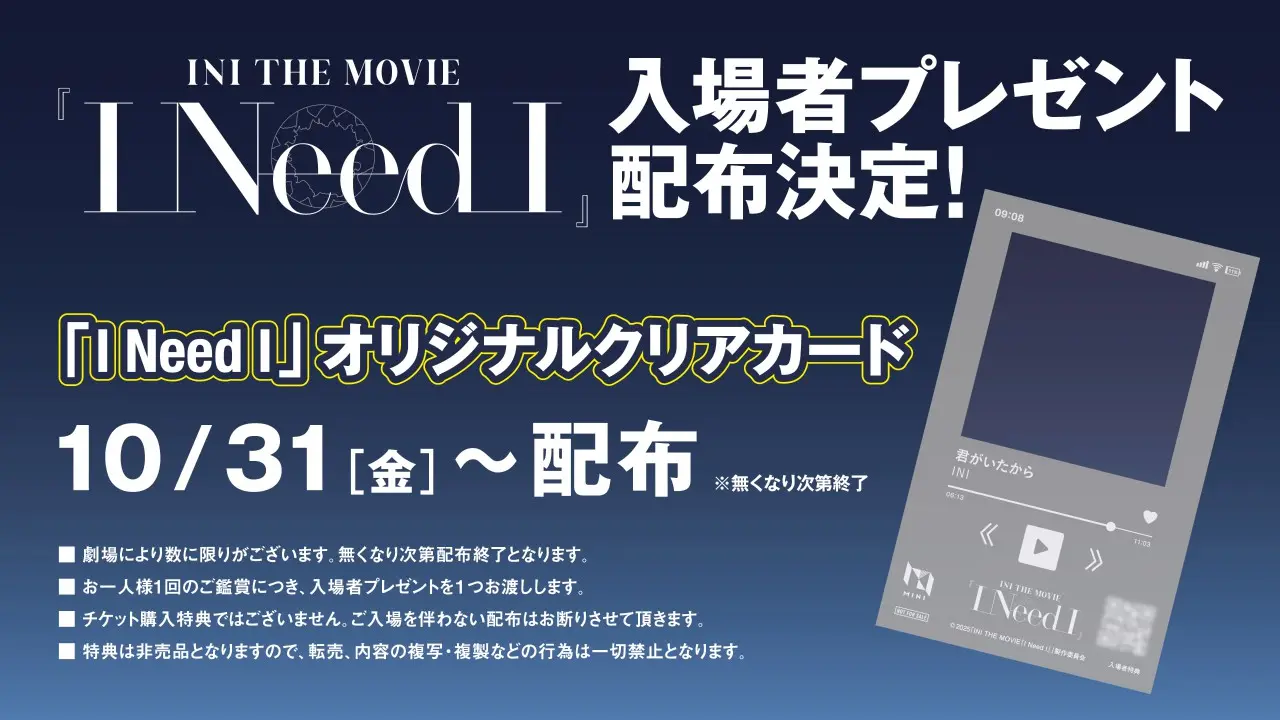 このたび、10月31日(金)に全国公開となるINI初のドキュメンタリー映画「INI THE MOVIE『I Need I』」の公開を記念して、公開日の10月31日(金)より、入場者プレゼント「『I Need I』オリジナルクリアカード」を配布することが決定した。