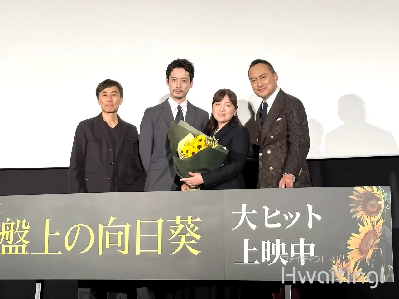 この日、スペシャルゲストとして原作者の柚月裕子も登壇。坂口、渡辺、熊澤監督に向日葵の花束を手渡しながら、感極まった表情で語った。