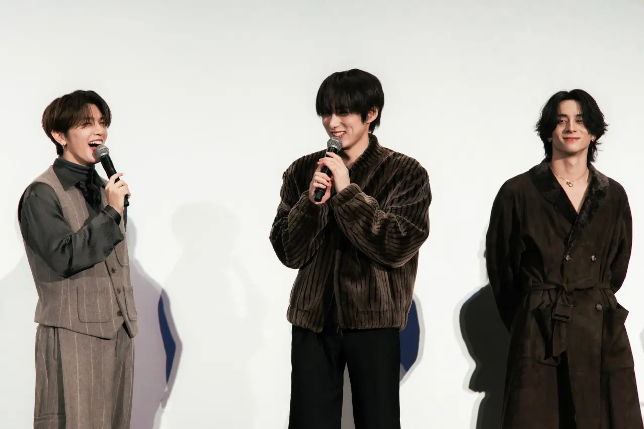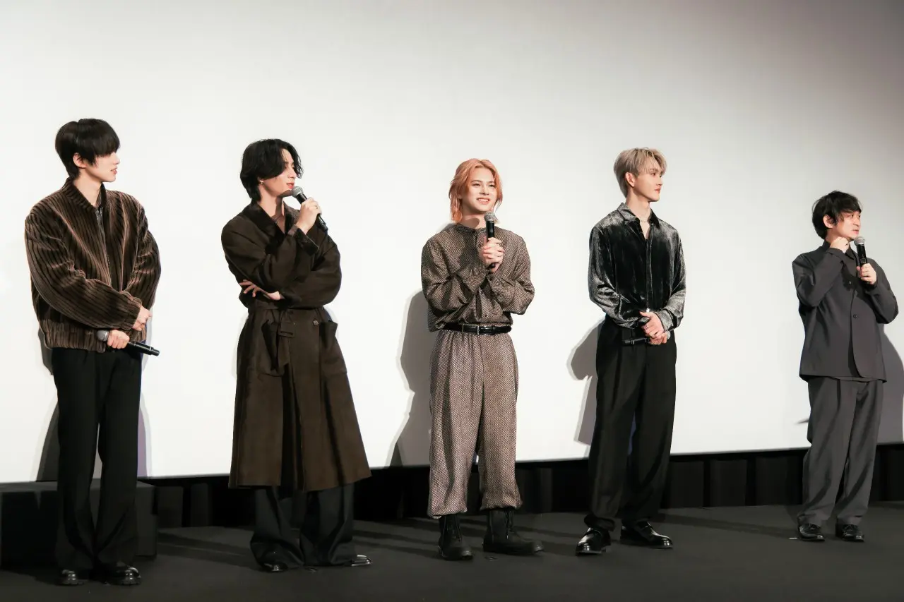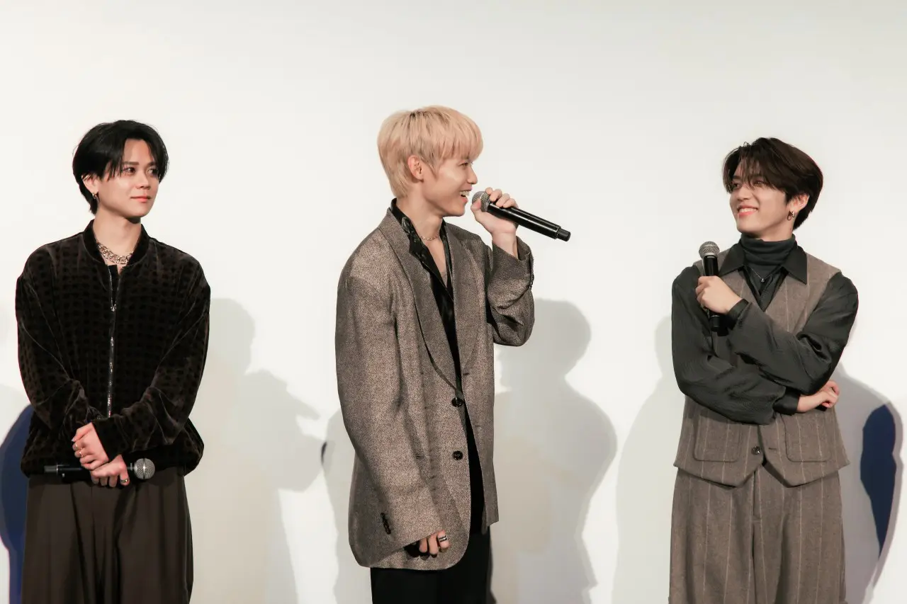先日映画が公開し、反響について聞かれた髙塚大夢は「公開初日からたくさんの人に観ていただけて、1回のみならずたくさん観てくれている方も多くてすごく嬉しいです。このライブビューイングもすぐに売り切れたという話を聞いて、本当にたくさんの人に愛されているなと感じましたし、とても光栄です」と答え、初めての密着ということで正直大変だったことについてエピソードを求められた藤牧京介は「朝ですかね、たくさんの現場にきてくださって朝早くから密着してくれていたんですよ!映画の密着が入っているので服装とか気をつけてくださいとマネージャーから連絡が入って、気をつけたのにそこが一切映画使われてないんですよ!監督ひとつもなかったですよ!(笑)」と明かしました。