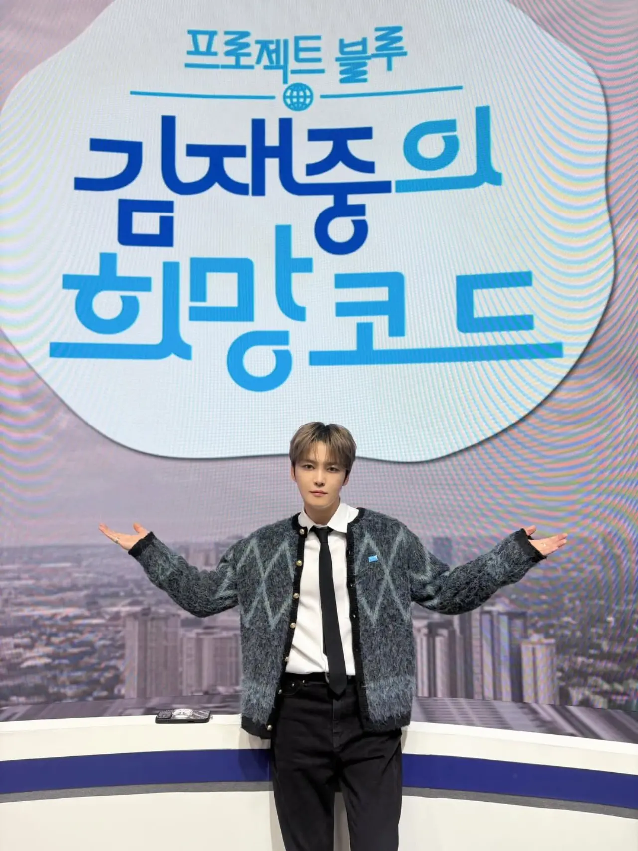 公開された写真には、番組セットと見られるスタジオ内での姿が収められている。大きなスクリーンには「プロジェクトブルー」「キム・ジェジュンの希望コード」と書かれたロゴが映し出され、ジェジュンは落ち着いた表情でカメラに向かって手を挙げたり、ピースサインを見せたりと、柔らかな雰囲気を漂わせている。チェック柄のカーディガンに白シャツ、黒のネクタイというシンプルな装いは、番組の真摯なテーマを象徴するかのようである。