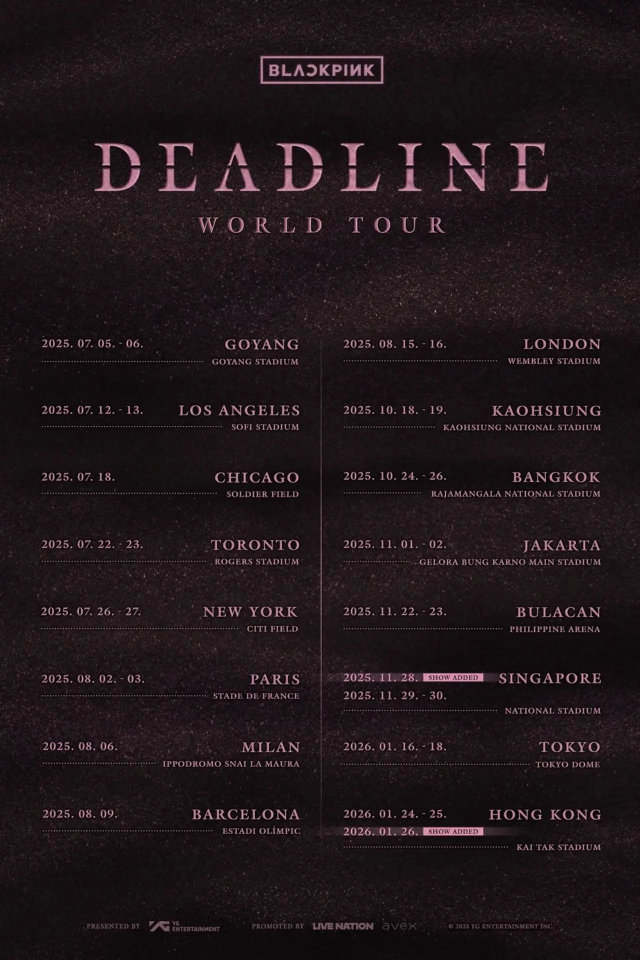 これで「BLACKPINK」はアジアだけで8都市、20回の公演を行うことになった。 先立って彼女らは7月に開催されたコヤン(高陽)公演を含め10月18日・19日に高雄、10月24日から26日にはバンコク、11月1日・2日にジャカルタ、11月22日・23日にブラカン、11月29日・30日にシンガポール、1月16日・17日に東京、1月24日・25日に香港公演開催のニュースを伝えた。