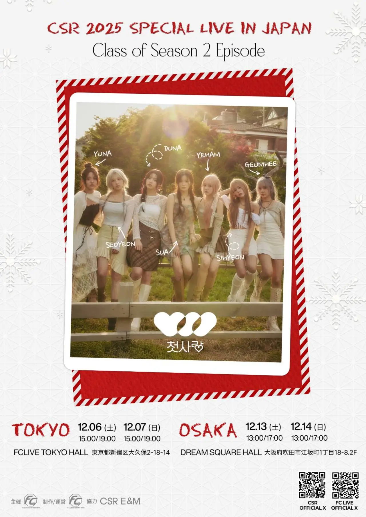 韓国の7人組ガールズグループ「CSR(チョッサラン)」が、12月6日(土)、7日(日)に東京・FC LIVE TOKYO HALL、12月13日(土)、14日(日)に大阪・DREAM SQUARE HALLにて、待望のスペシャルライブ「CSR SPECIAL LIVE IN JAPAN Class of Season 2 Episode」を開催することが決定した。