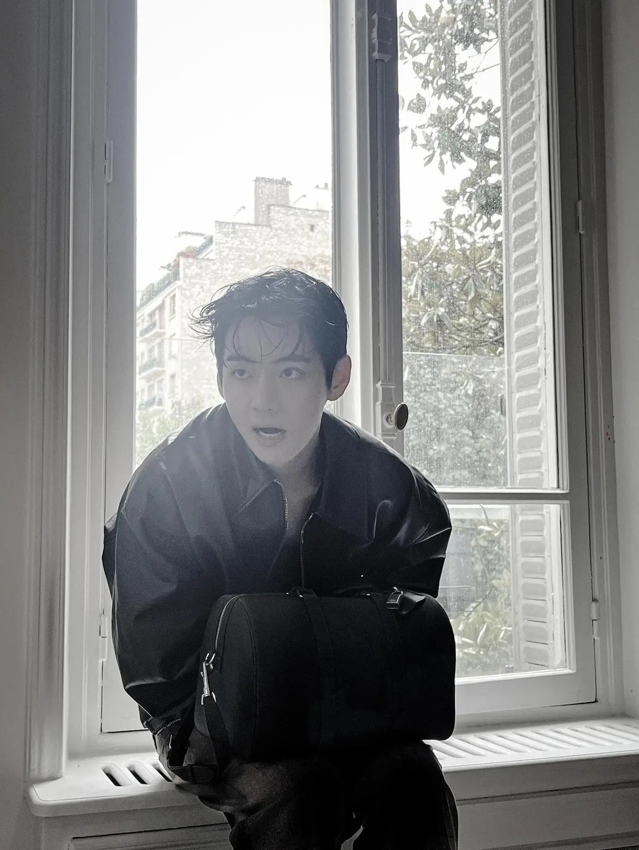 一緒に公開された写真には、レザージャケットをオシャレに着こなしたVの姿が盛り込まれている。