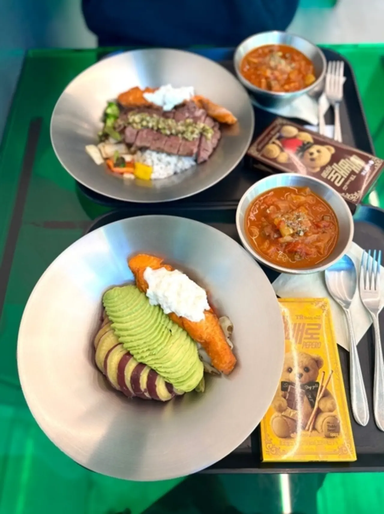 キム・ヘスは知人と食事をしている中で外食さえ健康に食べていて目を引く。