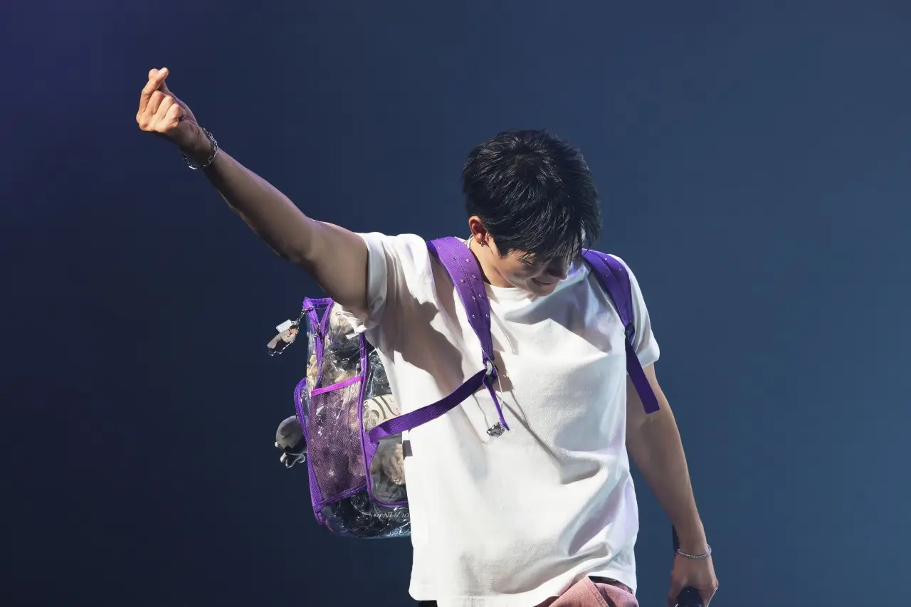透明のリュックを背負って、ちょっと照れくさそうに披露した「My baby U(エギヤ)」では、かわいらしいダンスで愛嬌(あいきょう)を振りまき、ファンの「エギヤ!」と叫ぶ声を全身で受け止めて満面の笑み。最後には投げキッスをするように指ハートを作って見せ、ファンにとびっきりの愛を届けた。