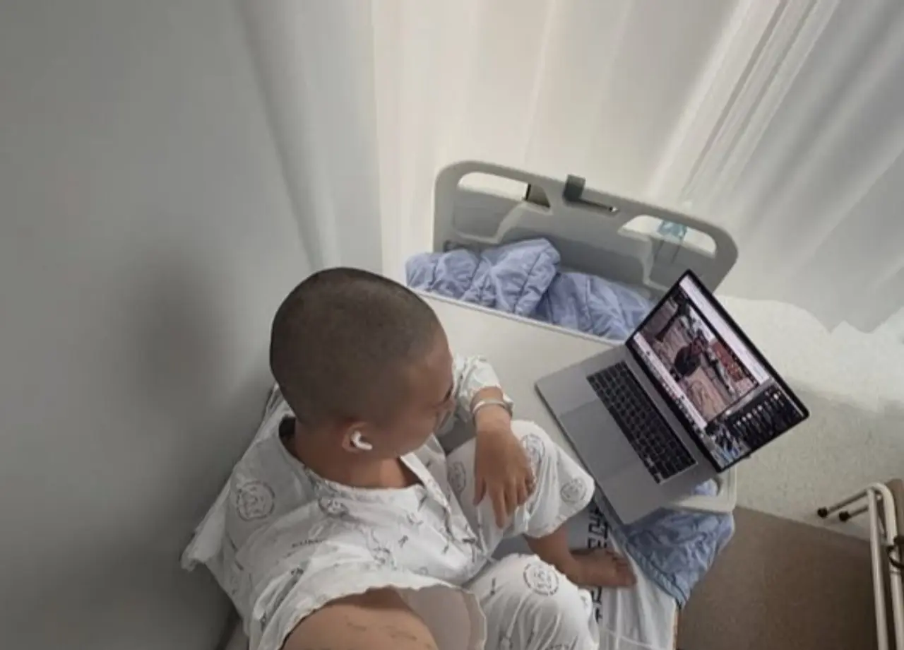 写真のチャ・ヒョンスンは病院に入院し、治療を受けている姿だ。つらい抗がん治療にも屈せず、明るい姿を見せている。