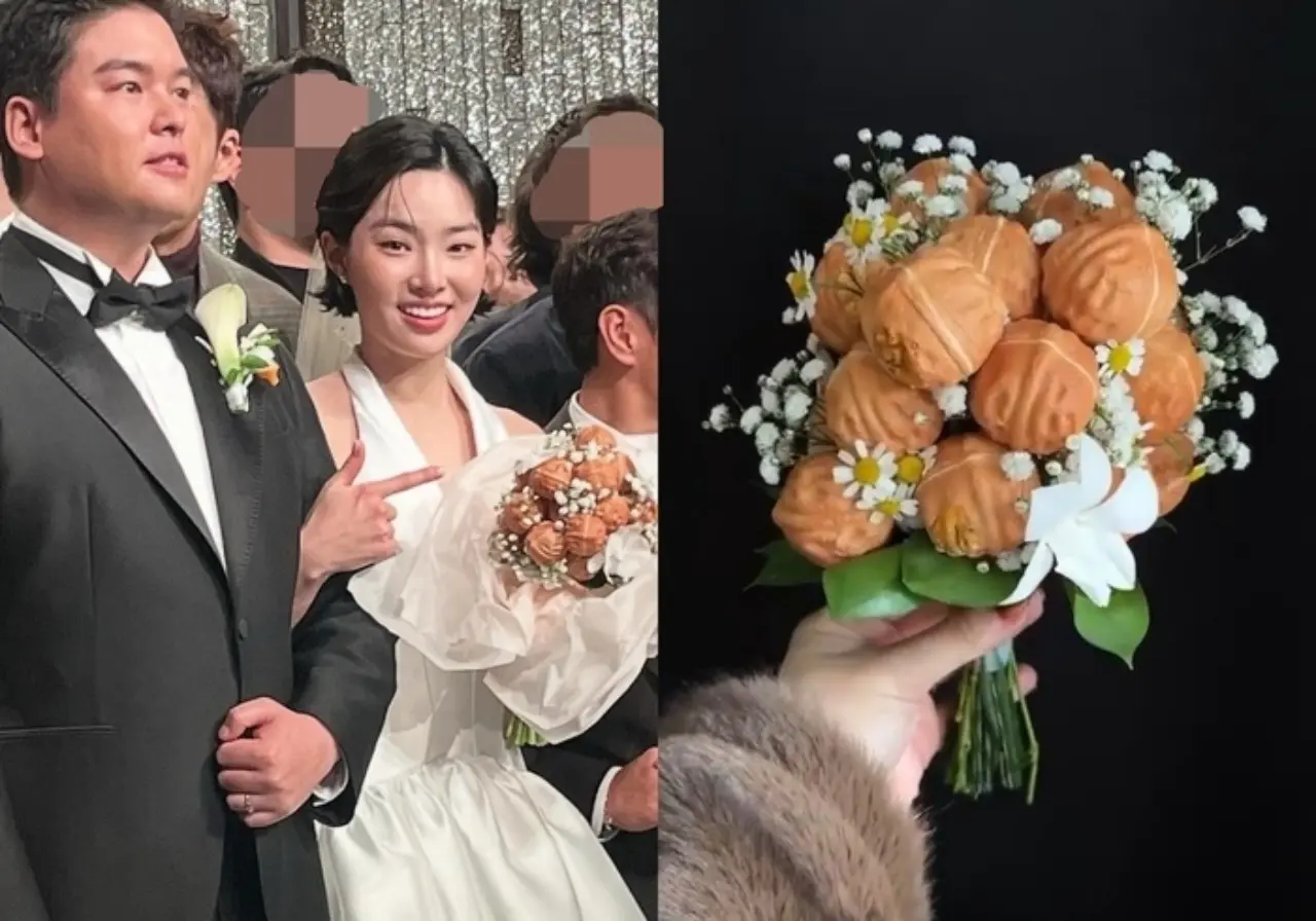 俳優イ・ジャンウと女優チョ・ヘウォンの結婚式で、“クルミ饅頭のブーケ”と異色の引き出物が、オンラインで話題だ。